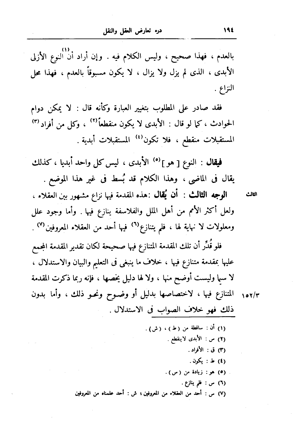 أن يقال: هذه المقدمة فيها نزاع مشهور بين العقلاء ولعل أكثر الأمم من أهل الملل والفلاسفة ينازع فيها وأما وجود علل ومعلولات لا نهاية لها فلم يتنازع فيها أحد من العقلاء المعروفين.