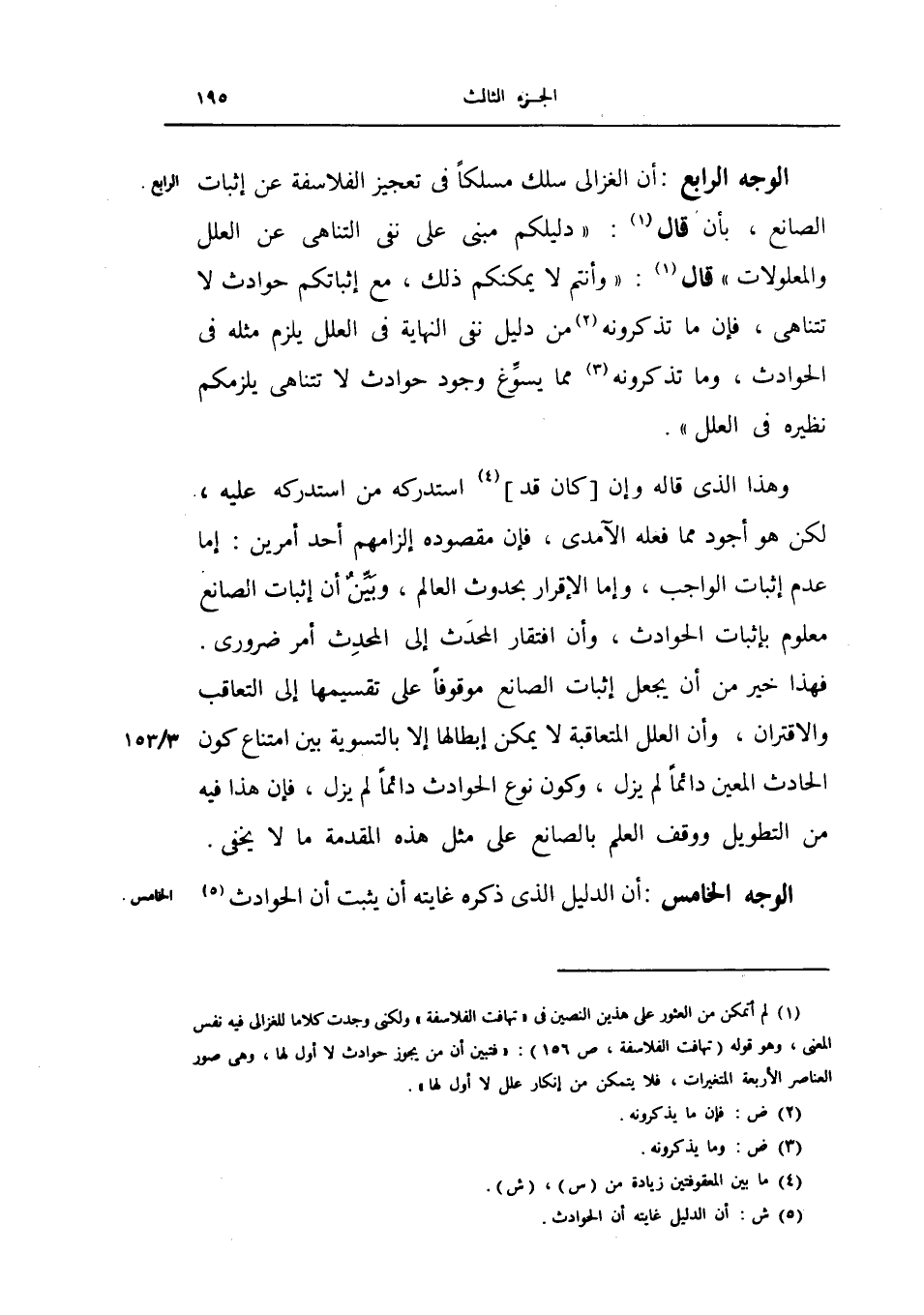 أن الغزالي سلك مسلكاً في تعجيز الفلاسفة عن إثبات الصانع، بان قال دليلكم مبني على نفي التناهي عن العلل والمعلولات قال وأنتم لا يمكنكم ذلك، مع إثباتكم حوادث لا تتناهى، فإن ما تذكرونه من دليل نفي النهاية في العلل يلزم مثله في الحوادث وما تذكرونه مما يسوغ وجود حوادث لا تتناهى يلزمكم نظيره في العلل.