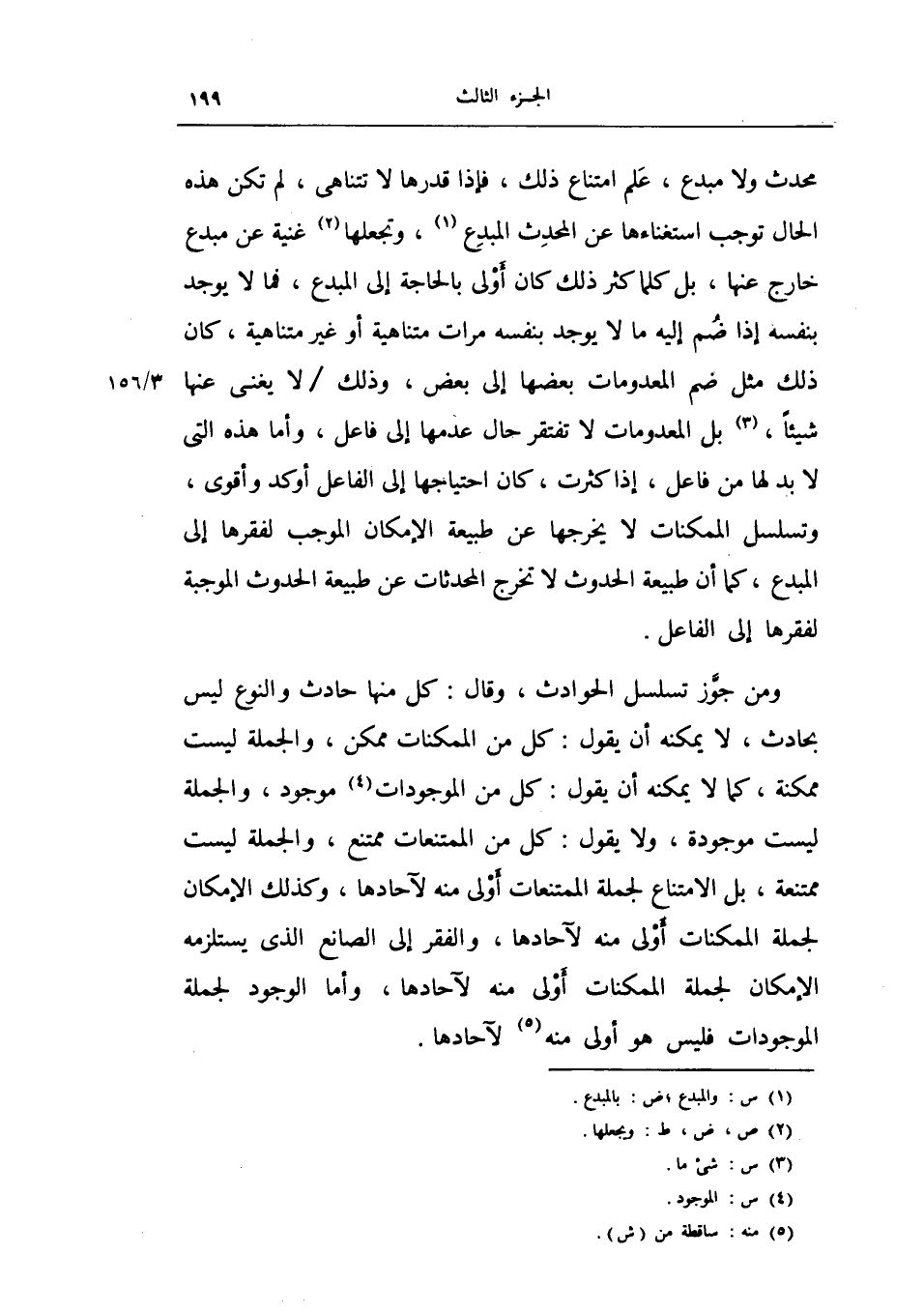 محدث ولا مبدع علم امتناع ذلك فإذا قدرها لاتتناهى، لم تكن هذه الحال توجب استغناءها عن المحدث المبدع، وتجعلها غنية عن مبدع خارج عنها بل كلما كثر ذلك كان أولى بالحاجة إلى المبدع، فما لا يوجد بنفسه إذا ضم إليه مالا يوجد بنفسه مرات متناهية أو غير متناهية، كان ذلك مثل ضم المعدومات بعضها إلى بعض، وذلك لا يغنى عنها شيئاً، بل المعدومات لا تفتقر حال عدمها إلى فاعل، وأما هذه التي لا بد لها من فاعل، إذا كثرت، كان احتياجها إلى الفاعل أوكد وأقوى، وتسلسل الممكنات لا يخرجها عن طبيعة الإمكان الموجب لفقرها إلى المبدع، كما أن طبيعة الحدوث لا تخرج المحدثات عن طبيعة الحدوث الموجبة لفقرها إلى الفاعل.