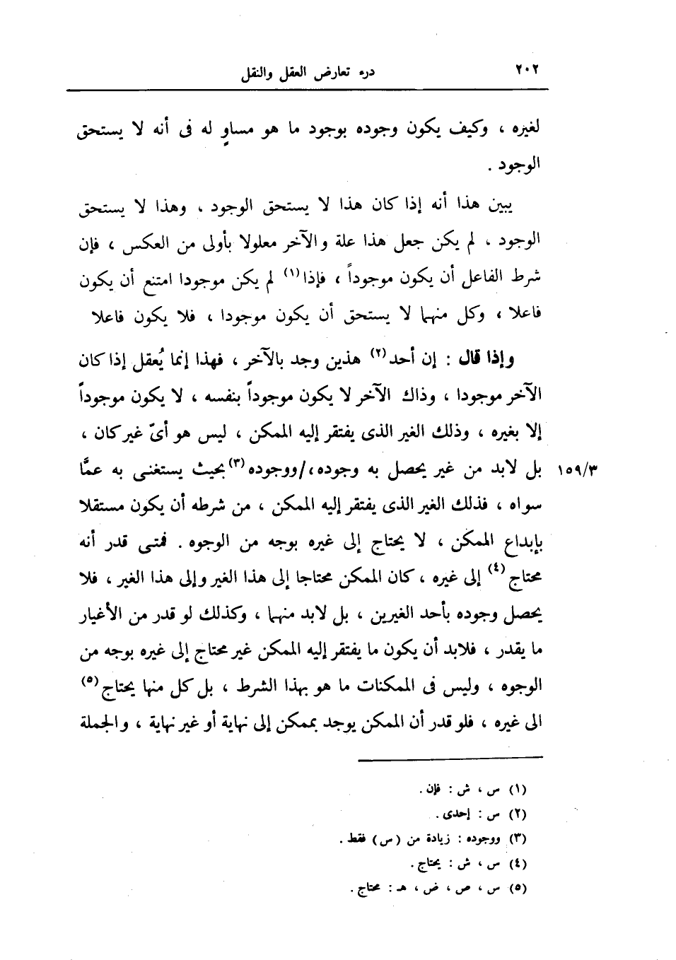 وإذا قال: إن أحد هذين وجد بالاخر فهذا إنما يعقل إذا كان الآخر موجوداً، وذاك الآخر لا يكون موجوداً بنفسه، لا يكون موجوداً إلا بغيره، وذلك الغير الذي يفتقر إليه الممكن، ليس هو أي غير كان، بل لا بد من غير يحصل به وجوده، ووجوده بحيث يستغنى به عما سواه، فلذلك الغير الذي يفتقر إليه الممكن، من شرطه أن يكون مستقلا بإبداع الممكن لا يحتاج إلى غيره بوجه من الوجوه فمتى قدر أنه محتاج إلى غيره، كان الممكن محتاجاً إلى هذا الغير وإلى هذا الغير، فلا يحصل وجوده بأحد الغيرين، بل لا بد منهما وكذلك لو قدر من الأغيار ما يقدر، فلا بد أن يكون ما يفتقر إليه الممكن غير محتاج إلى غيره بوجه من الوجوه، وليس الممكنات ما هو بهذا الشرط، بل كل منها يحتاج إلى غيره، فلو قدر أن الممكن يوجد بممكن إلى نهاية او غير نهاية، والجملة