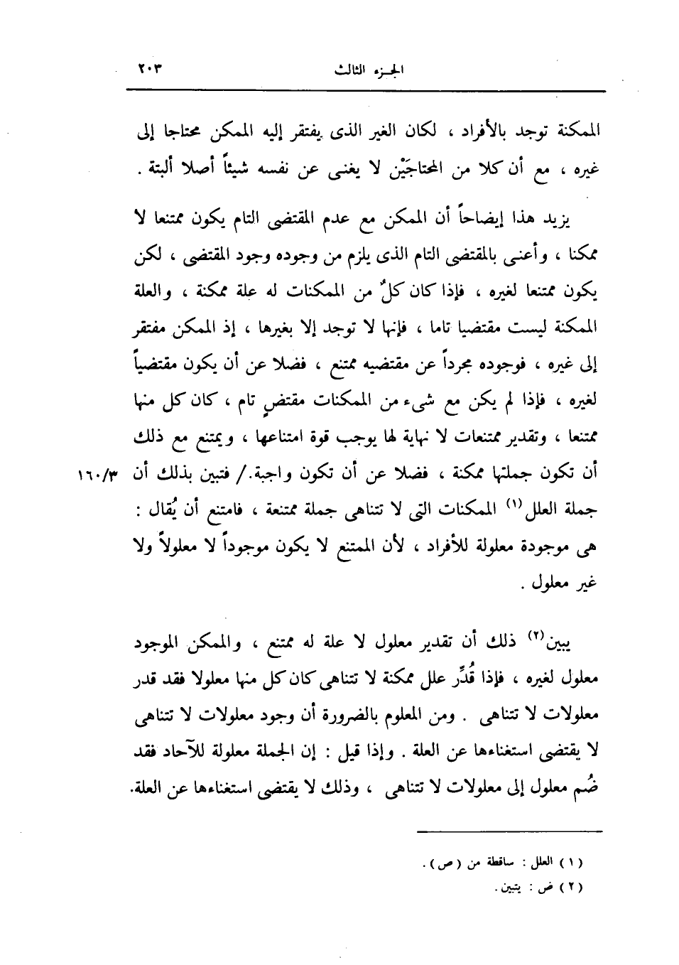 يبين ذلك ان تقدير معلول لا علة له ممتنع، والممكن الموجود معلول لغيره، فإذا قدر علل ممكنة لا تتناهى كان كل منها معلولاً فقد قدر معلولات لا تتناهي.