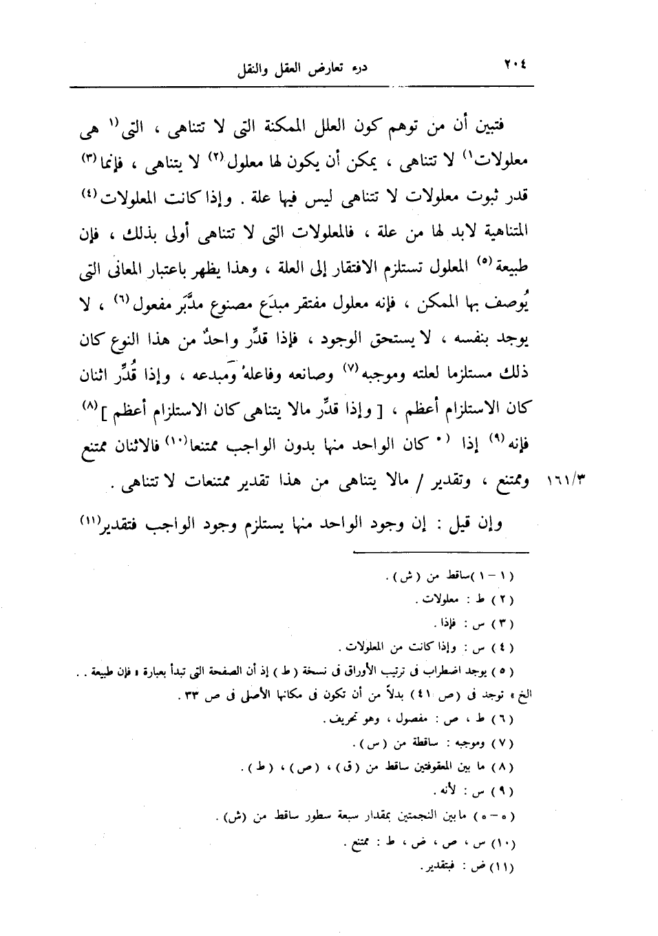 فتبين أن من توهم كون العلل الممكنة التي لا تتناهى، التي هي معلولات لا تتناهى، يمكن أن يكون لها معلول لا يتانهى، فإنما قدر ثبوت معلولات لا تتناهى ليس فيها علة.