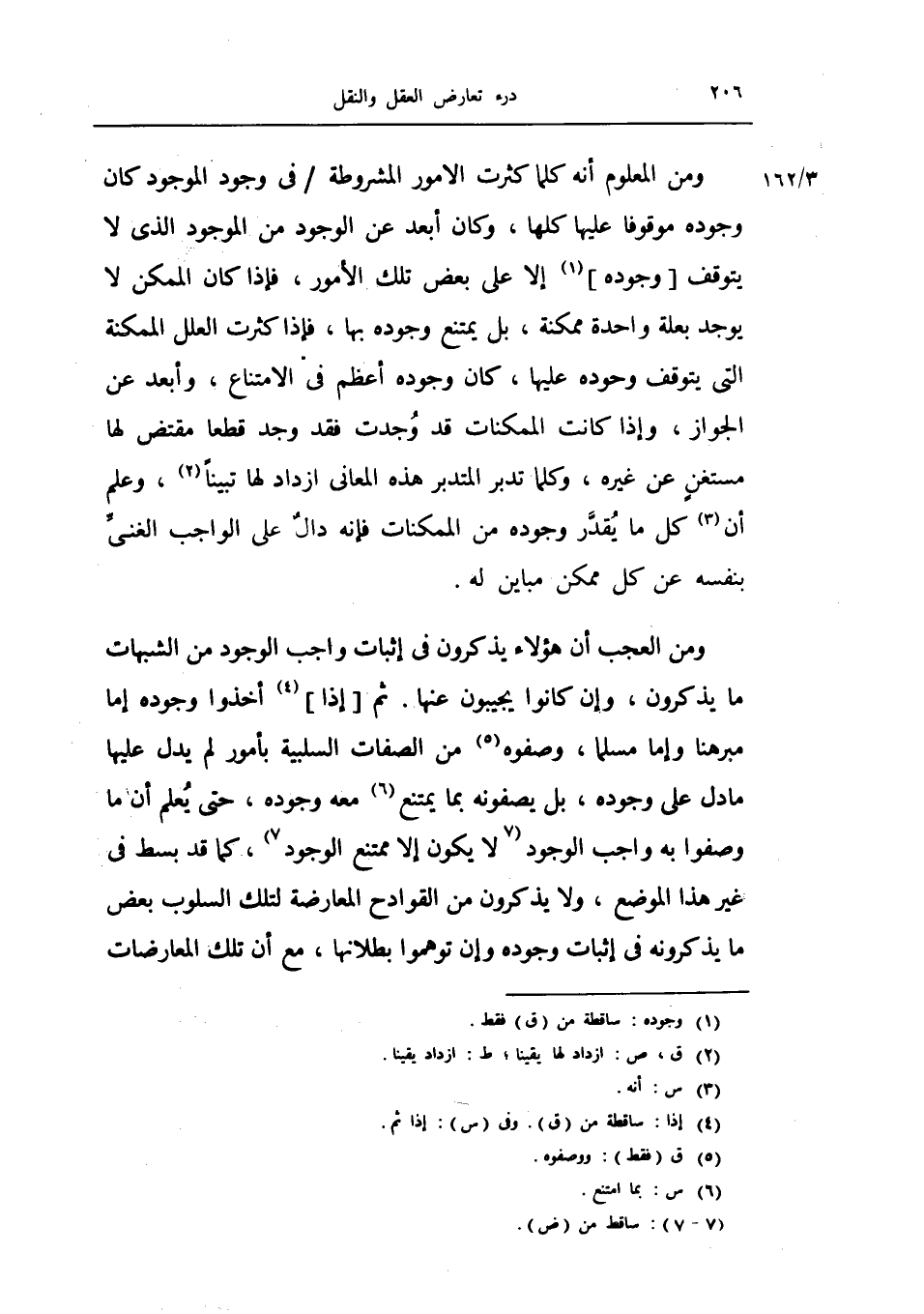 ومن المعلوم أنه كلما كثرت الأمور المشروطة في وجود الموجود كان وجوده موقوفاً عليها كلها، وكان أبعد عن الوجود من الموجود الذي لا يتوقف وجوده إلا على بعض تلك الأمور، فإذا كان الممكن لا يوجد بعلة واحدة ممكنة، بل يمتنع وجوده بها، فإذا كثرت العلل الممكنة التي يتوقف وجوده عليها، كان وجوده أعظم في الامتناع، وأبعد عن الجواز، وإذا كانت الممكنات قد وجدت فقد وجد قطعاً مقتض لها مستغن عن غيره وكلما تدبر المتدبر هذه المعاني أزداد لها تبيناً وعلم ان كل ما يقدر وجوده من الممكنات فإنه دال على الواجب الغني بنفسه عن كل ممكن مباين له.