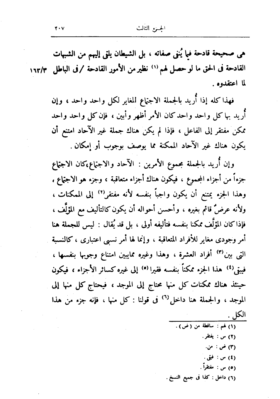 وإن أريد بالجملة مجموع الأمرين الآحاد والاجتماع، كان الاجتماع جزءاً من أجزاء المجموع، فيكون هناك اجزاء متعاقبة، وجزء هو الاجتماع، وهذا الجزء يمتنع أن يكون واجباً بنفسه لأنه مفتقر إلى الممكنات، ولأنه عرض قائم بغيره، واحسن احواله ان يكون كالتأليف مع المؤلف، فإذا كان المؤلف ممكناً بنفسه فتأليفه أولى، بل قد يقال: ليس للجملة هنا أمر وجودي مغاير للأفراد المتعاقبة، وإنما لها أمر نسبي اعتباري، كالنسبة التي بين أفراد العشرة، وهذا وغيره مما يبين امتناع وجوبها بنفسها، فيبقى هذا الجزء ممكناً بنفسه فقيراً إلى غيره كسائر الأجزاء، فيكون حينئذ هناك كل منها محتاج إلى الموجد، فيحتاج كل منها إلى الموجد، والجملة هنا داخل في قولنا: كل منها، فإنه جزء من هذا الكل