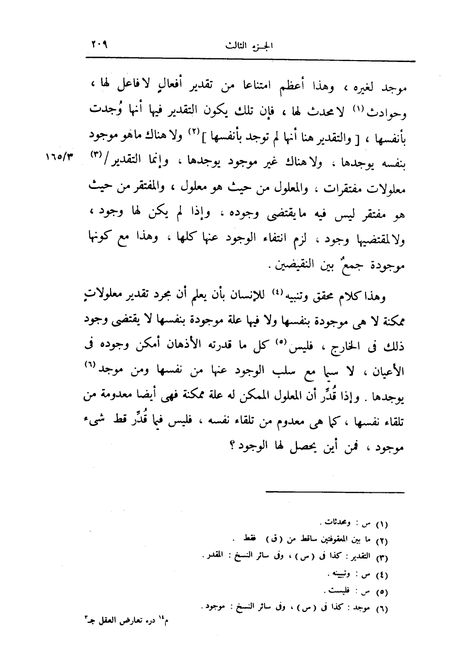 موجد لغيره، وهذا أعظم امتناعاً من تقدير أفعال لا فاعل لها، وجوادث لا محدث لها فإن تلك يكون التقدير فيها انها وجدت بلأنفسها، والتقدير هنا لم توجد بأنفسها ولا هناك ما هو موجود بنفسه يوجدها، ولا هناك غير موجود يوجدها وإنما التقدير معلولات مفتقرات، والمعلول من حيث هو معلول، والمفتقر من حيث هو مفتقر ليس فيه ما يقتضي وجوده، وإذا لم يكن لها وجود، ولا لمقتضيها وجود، لزم انتفاء الوجود عنها كلها، وهذا مع كونها موجودة جمع بين النقيضين