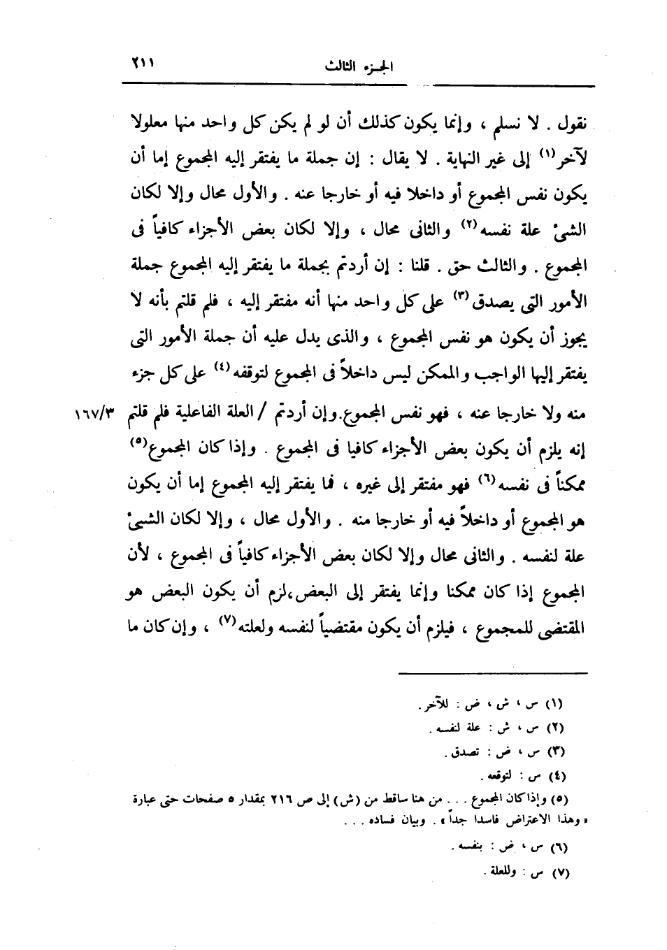 نقول لا نسلم وإنما يكون كذلك أن لو لم يكن كل واحد منها معولاً لآخر إلى غير النهاية لا يقال إن جملة ما يفتقر إليه المجموع إما ان يكون نفس المجموع أو داخلاً فيه أو خارجاً عنه والأول محال وإلا لكان الشيء علة نفسه والثاني محال، وإلا لكان بعض الأجزاء كافياً في المجموع والثالث حق قلنا إن أردتم بجملة ما يفتقر إليه المجموع جملة الأمور التي يصدق على كل واحد منها انه مفتقر إليه، فلم قلتم بانه لا يجوز أن يكون هو نفس المجموع، والذي يدل عليه أن جملة المور التي يفتقر إليها الواجب والممكن ليس داخلاً في المجموع لتوقفه على كل جزء منه ولا خارجاً عنه فهو نفس المجموع وإن أردتم