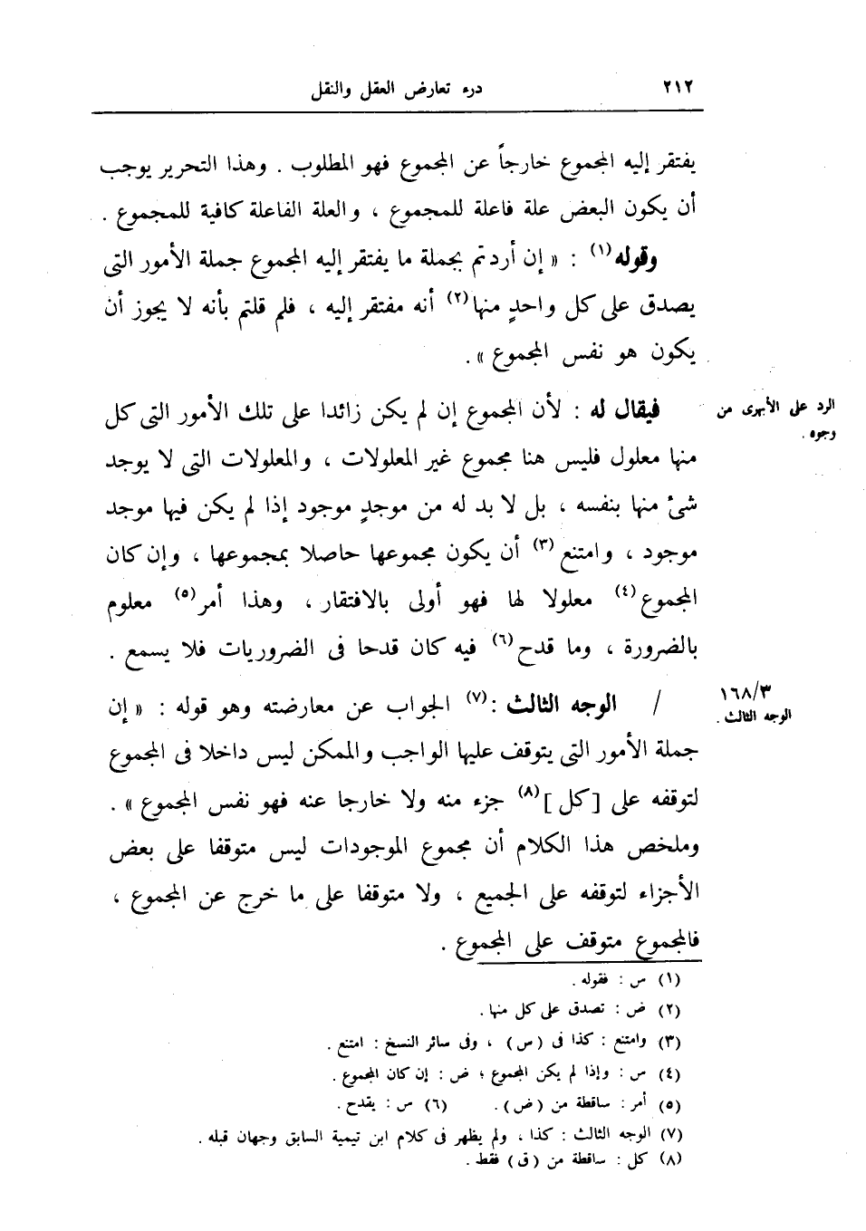 فيقال له: لأن المجموع إن لم يكن زائداً على تلك الأمور التي كل منها معلول فليس هنا مجموع غير المعلولات، والمعلولات التي لا يوجد شيء منها بنفسه، بل لا بد له من موجد موجود إذا لم يكن فيها موجد موجود، وامتنع ان يكون مجموعها حتصلاً بمجموعها، وإن كان المجموع معلولاً لها فهو اولى بالافتقار، وهذا امر معلوم بالضرورة وما قدح فيه كان قدحاً في الضروريات فلا يسمع