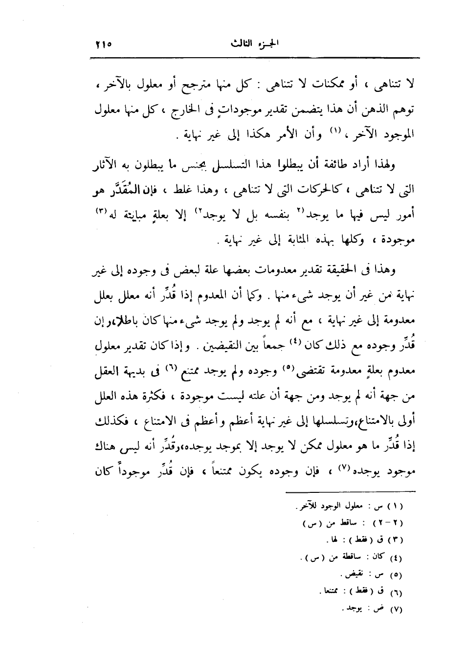وهذا في الحقيقة تقدير معدومات بعضها علة لبعض في وجوده إلى غير نهاية من غير أن يوجد شيء منها وكما أن المعدوم إذا كان باطلاً وإن قدر وجوده مع ذلك كان جمعاً بين النقيضين وإذا كان تقدير معلول معدوم بعلة معدومة تقتضي وجوده ولم يوجد ممتنع في بديهة العقل من جهة انه لم يوجد ومن جهة أن علته ليست موجودة، فكثرة هذه العلل اولى بالامتناع، وتسلسلها إلى غير نهاية اعظم في الامتناع، فكذلك إذا قدر ما هو معلول ممكن لا يوجد إلا بموجد يوجده، وقدر انه ليس هناك موجود يوجده، فإن وجوده يكون ممتنعاً، فإن قدر موجوداً كان