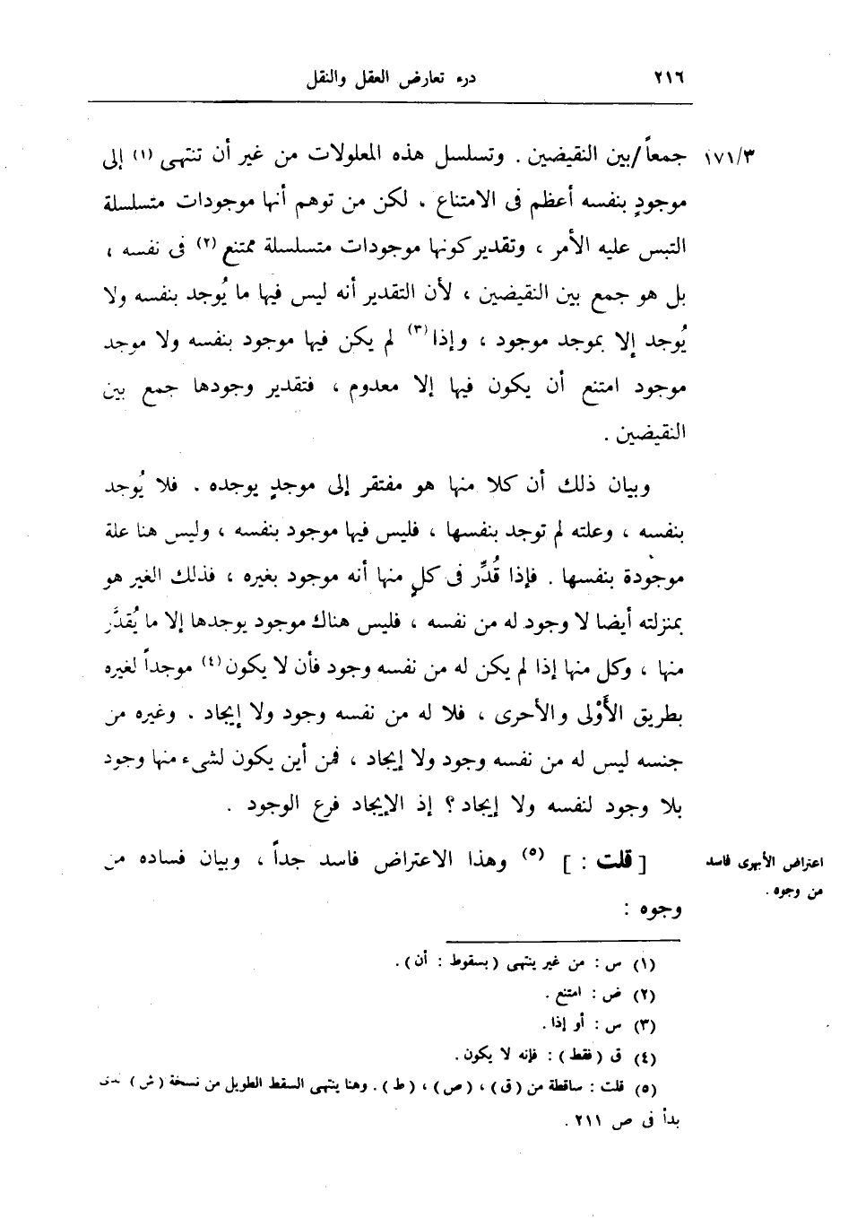 جمعاً بين النقيضين. وتسلسل هذه المعلولات من غير أن تنتهي إلى موجوداً بنفسه أعظم في الامتناع، لكن من توهم أنها موجودات متسلسلة التبس عليه المر، وتقدير كونها موجودات متسلسلة ممتنع في نفسه، بل هو جمع بين النقيضين، لأن التقدير انه ليس فيها ما يوجد بنفسه ولا يوجد إلا بموجد موجود، وإذا لم يكن فيها موجود بنفسه ولا موجد موجود امتنع أن يكون فيها إلا معدوم، فتقدير وجودها جمع بين النقيضين