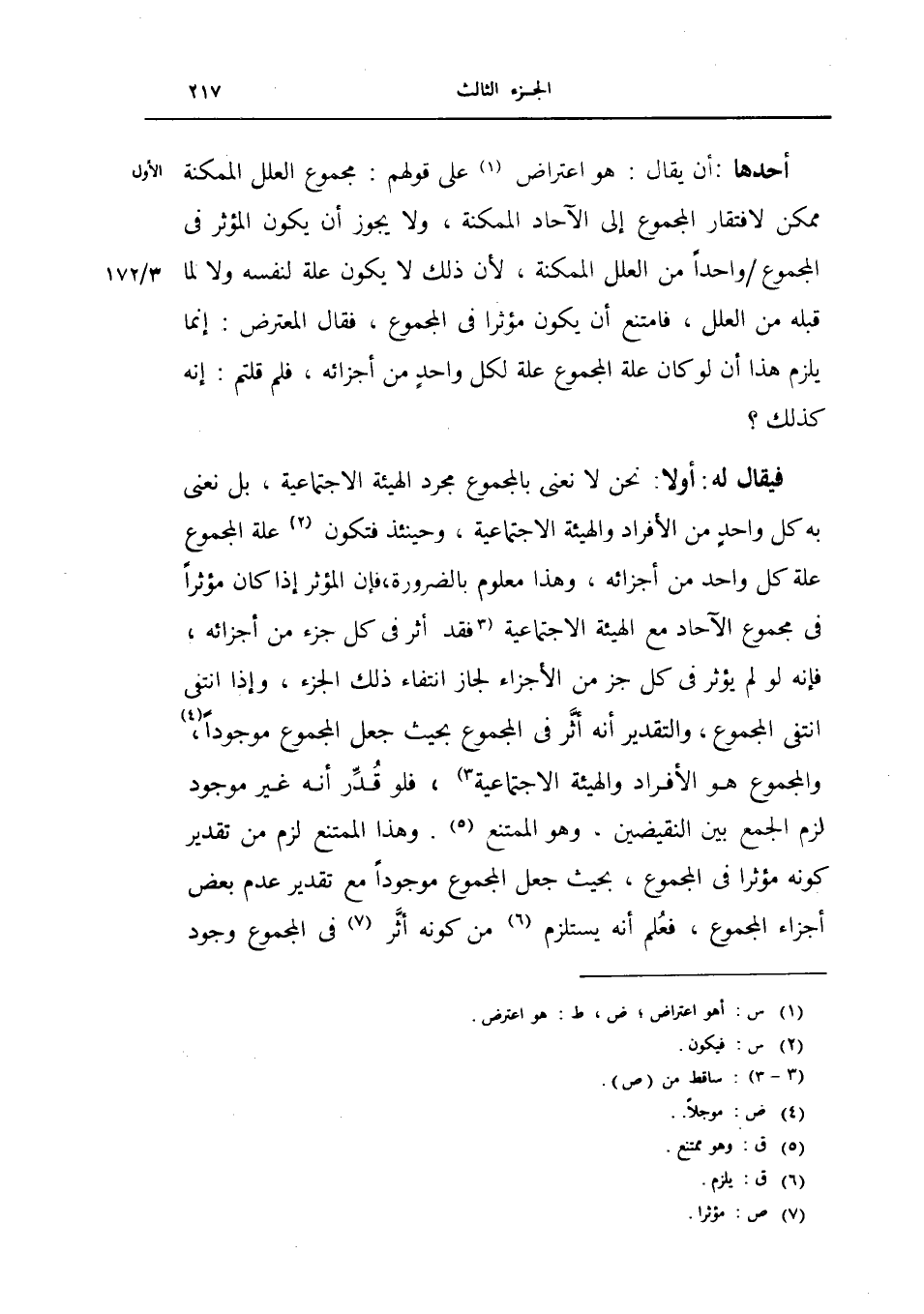 الوجه الأول: أن يقال: هو اعتراض على قولهم مجموع العلل الممكنة ممكن لافتقار المجموع إلى الآحاد الممكنة ولا يجوز أن يكون المؤثر في المجموع واحداً من العل الممكنة، لن ذلك لا يكون علة لنفسه ولا لما قبله من العلل، فامتنع أن يكون مؤثراً في المجموع، فقال المعترض: إنما يلزم هذا أن لو كان علة المجموع علة لكل واحد من أجزائه فلم قلتم إنه كذلك؟