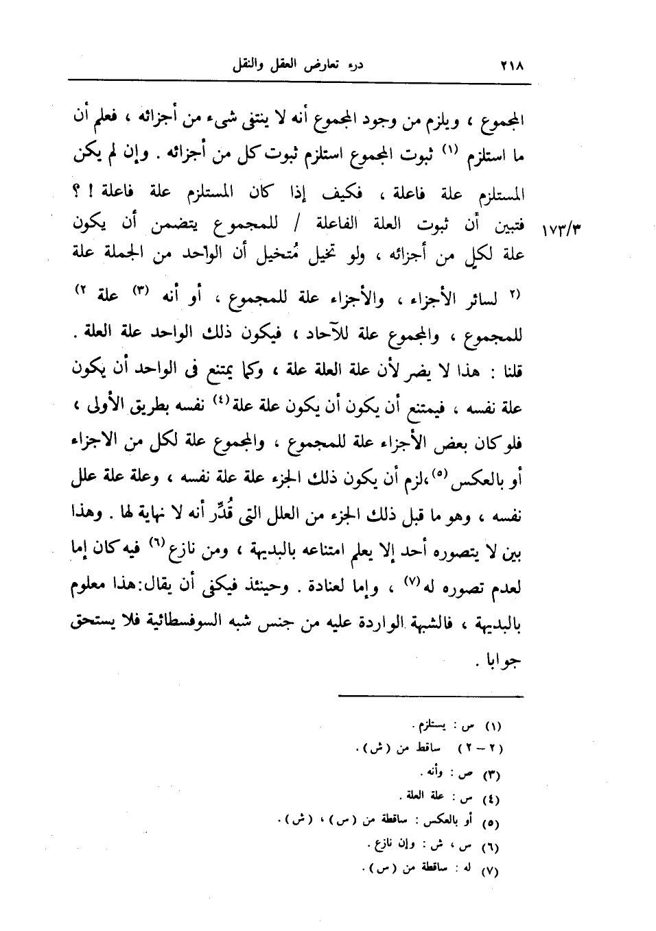 قلنا هذا لا يضر لأن العلة علة، وكما يمتنع في الواحد أن يكون علة علة نفسه، فيمتنع أن يكون علة نفسه بطريق الأولى، فلو كان بعض الأجزاء علة للمجموع، والمجموع علة لكل من الأجزاء أو بالعكس، لزم أن يكون ذلك الجزء علة علة نفسه، وعلة علل نفسه، وهو ما قبل ذلك الجزء من العلل التي قدر أنه لا نهاية لها وهذا بين لا يتصوره أحد إلا يعلم امتناعه بالبديهة، ومن نازع فيه كان إما لعدم تصوره له، وإما لعنادة وحينئذ فيكفي أن يقال: هذا معلوم بالبديهة، فالشبهة الواردة عليه من جنس شبه السوفسطائية فلا يستحق جواباً.
