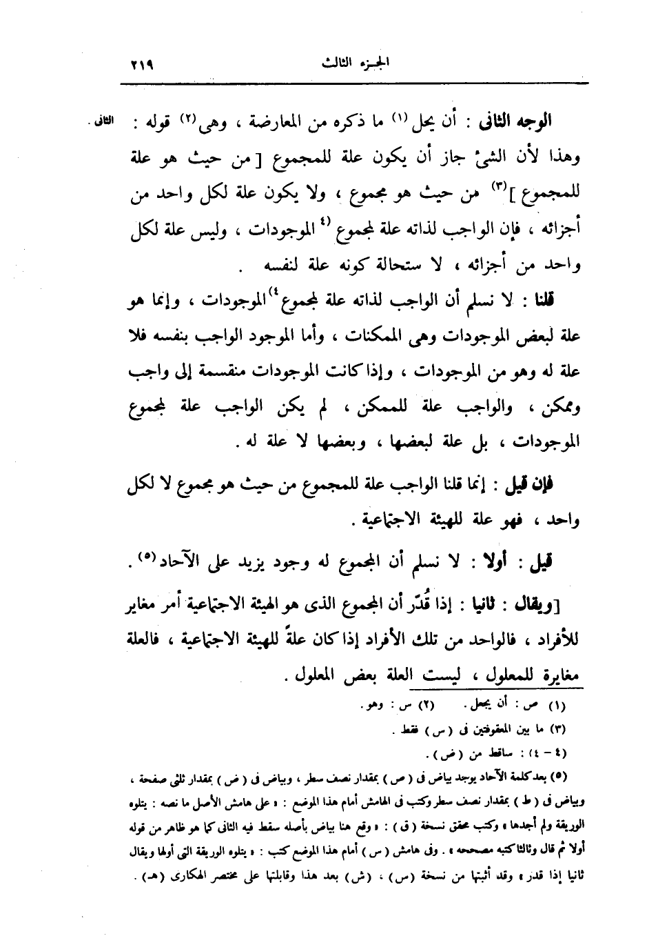 قيل: أولا: لا نسلم أن المجموع له وجود يزيد على الآحاد ويقال: ثانياً إذا قدر أن المجموع الذي هو الهيئة الاجتماعية أمر مغاير للأفراد فالواحد من تلك الأفراد إذا كان علة للهيئة الاجتماعية فالعلة مغايرة للمعلول، ليست العلة بعض المعلول.