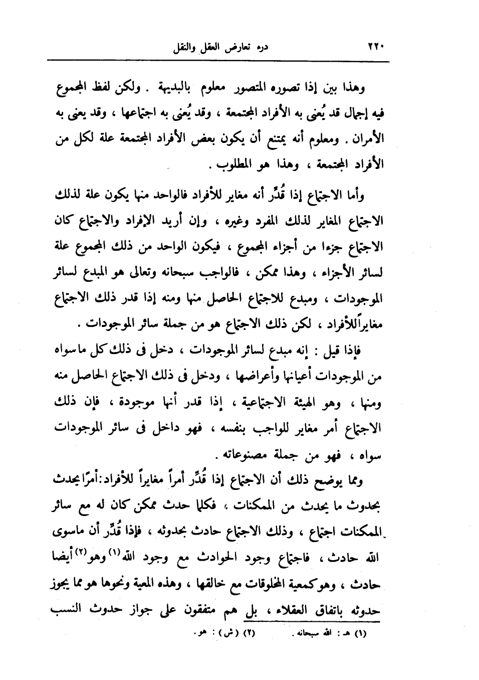 ولكن لفظ المجموع فيه إجمال قد يعنى به الأفراد المجتمعة، وقد يعنى به اجتماعها، وقد يعنى به الأمران ومعلوم انه يمتنع أن يكون بعض الأفراد المجتمعة علة لكل من الأفراد المجتمعة وهذا هو المطلوب.