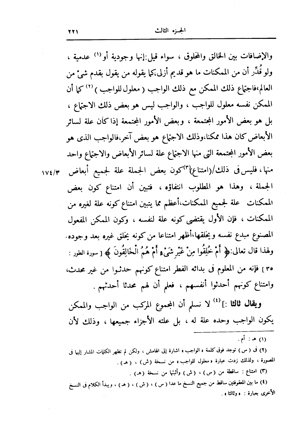 والإضافات بين الخالق والمخلوق، سواء قيل: إنها وجودية أو عدمية، ولو قدر أن من الممكنات ما هو قديم أزلي، كما يقوله من يقول بقدم شيء من العالم، فاجتماع ذلك الممكن مع ذلك الواجب معلول للواجب، والواجب ليس هو بعض ذلك الاجتماع بل هو بعض الأمور المجتمعة، وبعض الأمور المجتمعة إذا كان علة لسائر الأبعاض كان هذا ممكناً وذلك الاجتماع هو بعض آخر، فالواجب الذي هو بعض الأمور المجتمعة التي منها الاجتماع علة لسائر الأبعاض والاجتماع واحد منها، فليس في ذلك امتناع كون بعض الجملة علة لجميع أبعاض الجملة، وهذا هو المطلوب انتقاؤه، فتبين أن امتناع كون بعض الممكنات، فإن الأول يقتضى كونه علة لنفسه، وكون الممكن المفعول المصنوع مبدع نفسه ويخلقها أظهر امتناعاً من كونه يخلق غيره بعد وجوده.