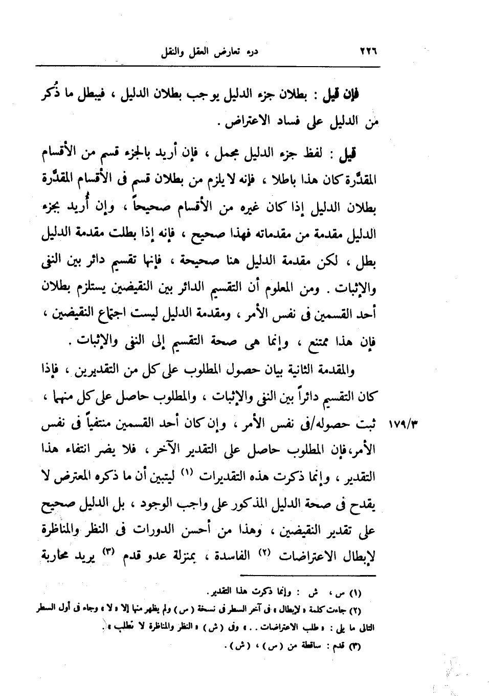 والمقدمة الثانية حصول المطلوب على كل من التقديرين فإذا كان التقسيم دائراً بين النفي والإثبات والمطلوب حاصل على كل منهما ثبت حصوله في نفس الأمر وغن كان احد القسمين منتفياً في نفس الأمر فغن المطلوب حاصل على التقدير الآخر فلا يضر انتفاء هذا التقدير، وإنما ذكرت هذه التقديرات ليتبين أن ما ذكره المعترض لا يقدح في صحة الدليل المذكور على واجب الوجود بل الدليل صحيح على تقدير النقيضين وهذا من أحسن الدورات في النظر والمناظر لإبطال الاعتراضات الفاسدة بمنزلة عدو قدم يريد محاربة