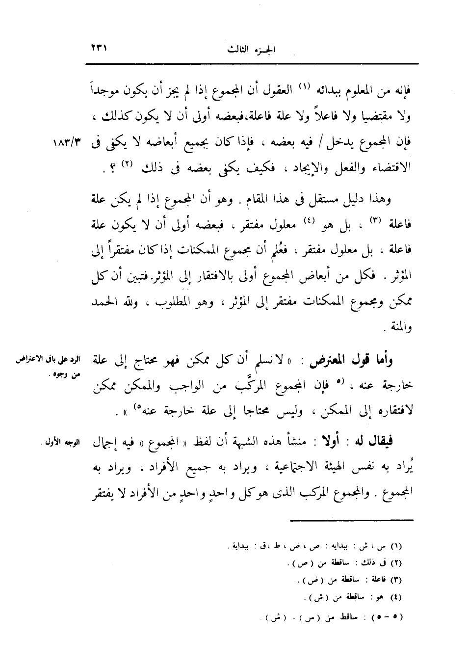 وأما قول المعترض: لانسلم أن كل ممكن فهو محتاج إلى علة خارجة عنه إن المجموع المركب من الواجب والممكن ممكن لافتقاره إلى الممكن وليس محتاجاً إلى علة خارجة عنه.