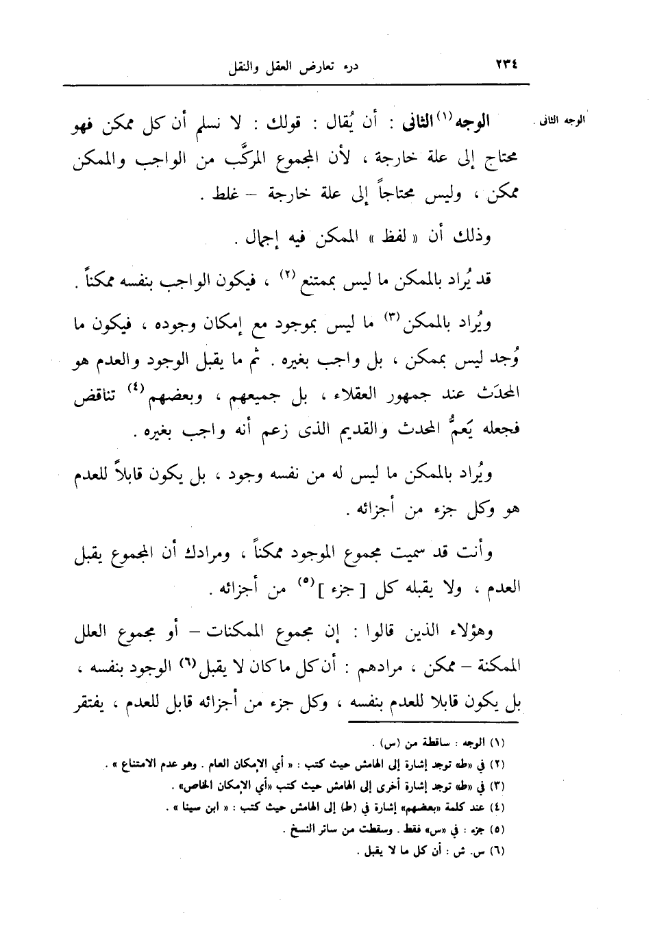 وهؤلاء الذين قالوا: إن مجموع الممكنات أو مجموع العلل الممكنة ممكن مرادهم أن كل ما كان لا يقبل الوجود بنفسه، بل يكون قابلاً للعدم بنفسه، وكل جزء من أجزائه قابل للعدم، يفتقر
