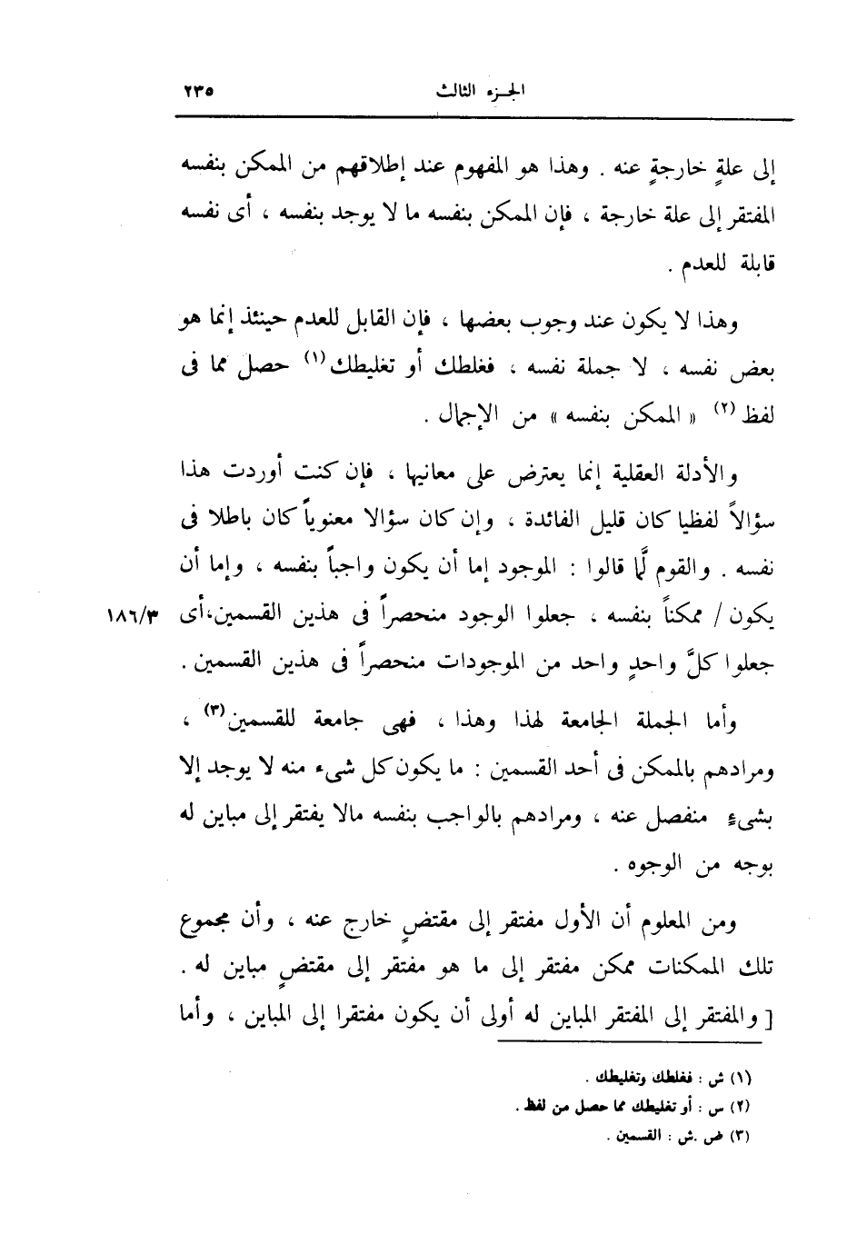وأما الجملة الجامعة لهذا وهذا، فهي جامعة للقسمين، ومرادهم بالممكن في أحد القسمين: ما يكون كل شيء منه لا يوجد إلا بشيء منفصل عنه ومرادهم بالواجب بنفسه مالا يفتقر إلى مباين له بوجه من الوجوه.