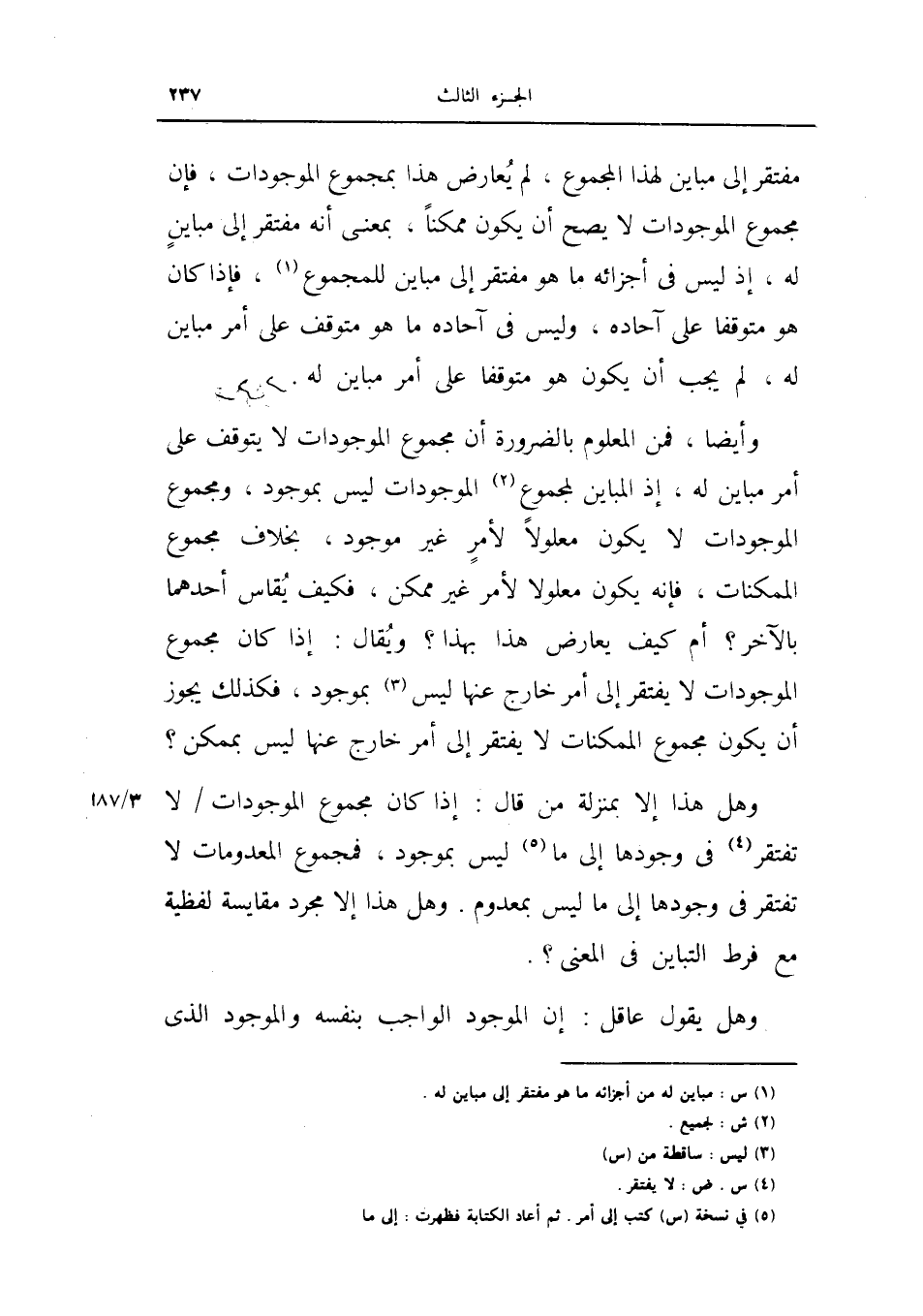 مفتقر إلى مباين لهذا المجموع، لم يعارض هذا المجموع الموجودات، فإن مجموع الموجودات لا يصح أن يكون ممكناً بمعنى أنه مفتقر إلى مباين له إذ ليس في أجزائه ما هو مفتقر إلى مباين للمجموع، فإذا كان هو متوقفاً على آحاده، وليس في آحاده ما هو متوقف على أمر مباين له، لم يجب أن يكون هو متوقفاً على أمر مباين له