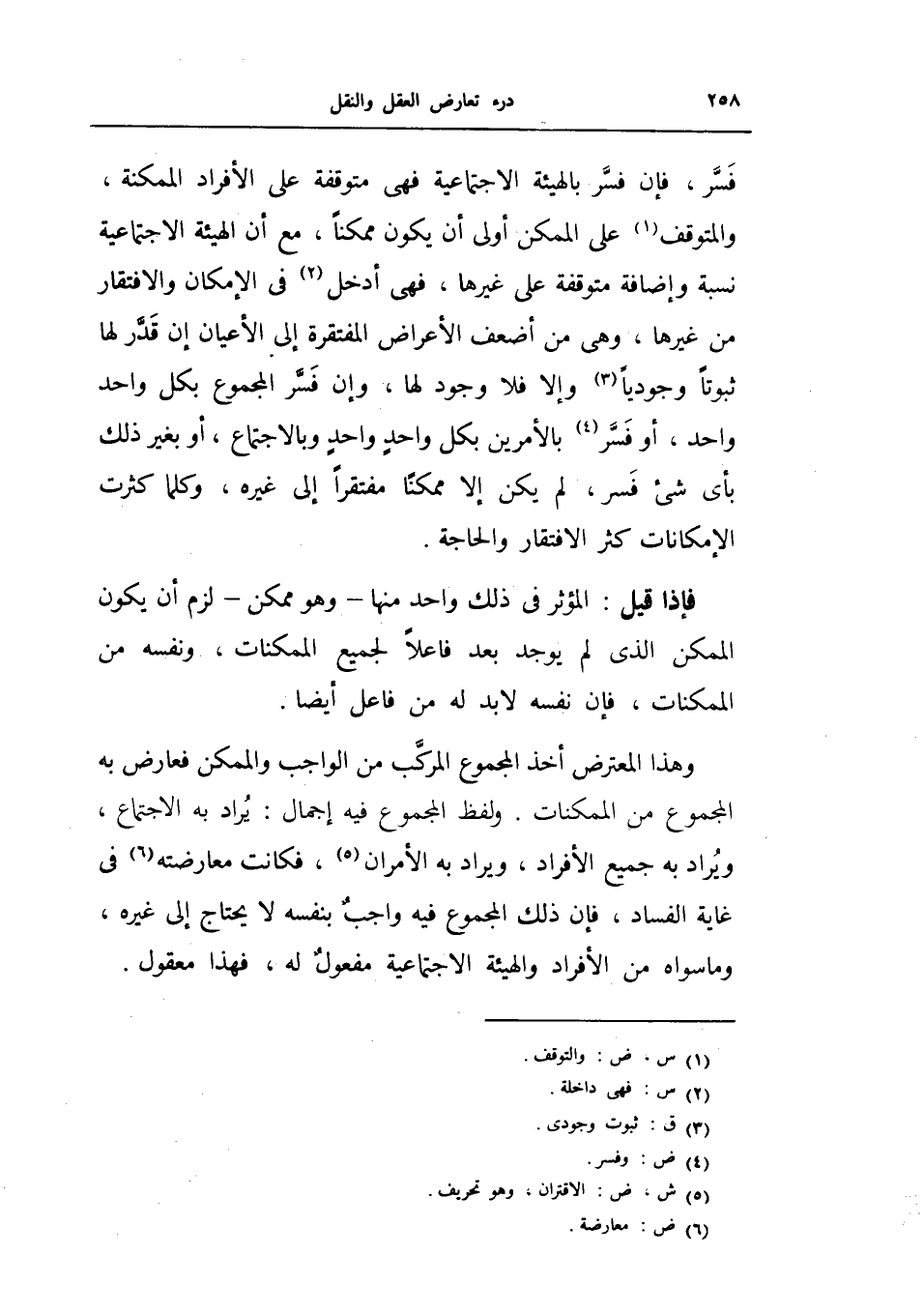 فسر، فإن فسر بالهيئة الاجتماعية فهي متوقفة على الأفراد الممكنة، والمتوقف على الممكن أولى أن يكون ممكناً، مع أن الهيئة الاجتماعية نسبة وإضافة متوقفة على غيرها، فهي ادخل في الإمكان والافتقار من غيرها وهي من أضعف الأعراض المفتقرة إلى الأعيان إن قدر لها ثبوتاً وجودياً وإلا فلا وجود لها وإن فسر المجموع بكل واحد واحد، أو فسر بالأمرين بكل واحد بالاجتماع، أو بغير ذلك بأي شيء فسر، لم يكن إلا ممكناً مفتقراً إلى غيره، وكلما كثرت الإمكانات كثر الافتقار والحاجة