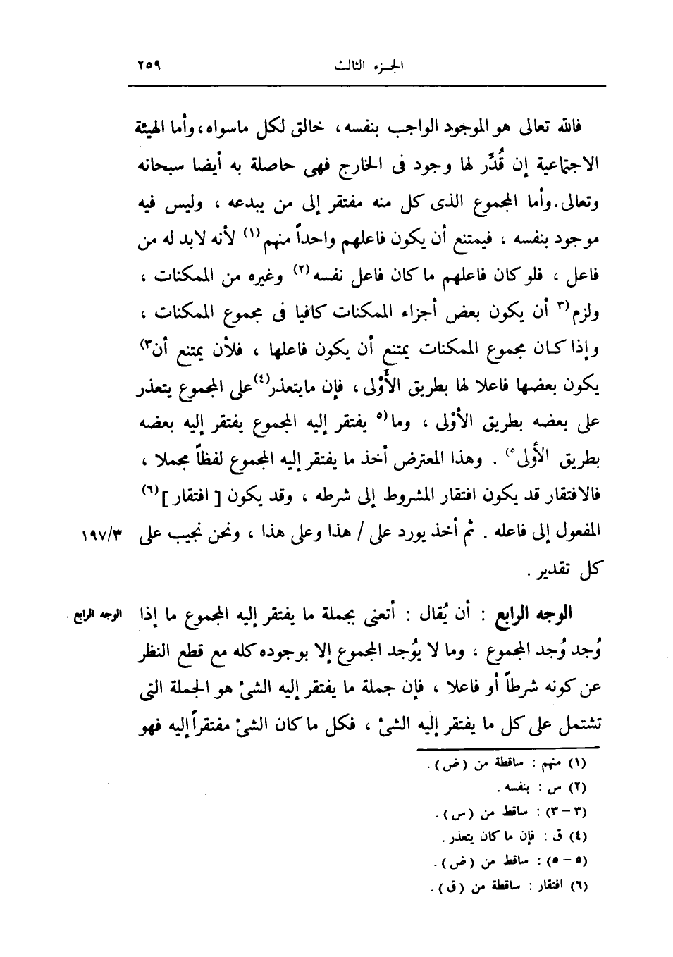 فالله تعالى هو الموجود الواجب بنفسه، خالق لكل ما سواه وأما الهيئة الاجتماعية إن قدر لها وجود في الخارج فهي حاصلة به أيضاً سبحانه وتعالى. وأما المجموع الذي كل منه مفتقر إلى من يبدعه، وليس فيه موجود بنفسه، فيمتنع أن يكون فاعلهم واحداً منهم لأنه لا بد له من فاعل، فلو كان فاعلهم ما كان فاعل نفسه وغيره من الممكنات، ولزم أن يكون بعض أجزاء الممكنات كافياً في مجموع الممكنات، وإذا كان مجموع الممكنات يمتنع أن يكون فاعلها، فلأن يمتنع أن يكون بعضها فاعلاً لها بطريق الأولى، فإن ما يتعذر على المجموع يتعذر على بعضه بطريق الأولى، وما يفتقر إليه المجموع يفتقر إليه بعضه بطريق الأولى. وهذا المعترض أخذ ما يفتقر إليه المجموع لفظاً مجملاً، فالافتقار قد يكون افتقار المشروط إلى شرطه، وقد يكون افتقار المفعول إلى فاعله0 ثم أخذ يورد على هذا وعلى هذا، ونحن نجيب على كل تقدير.