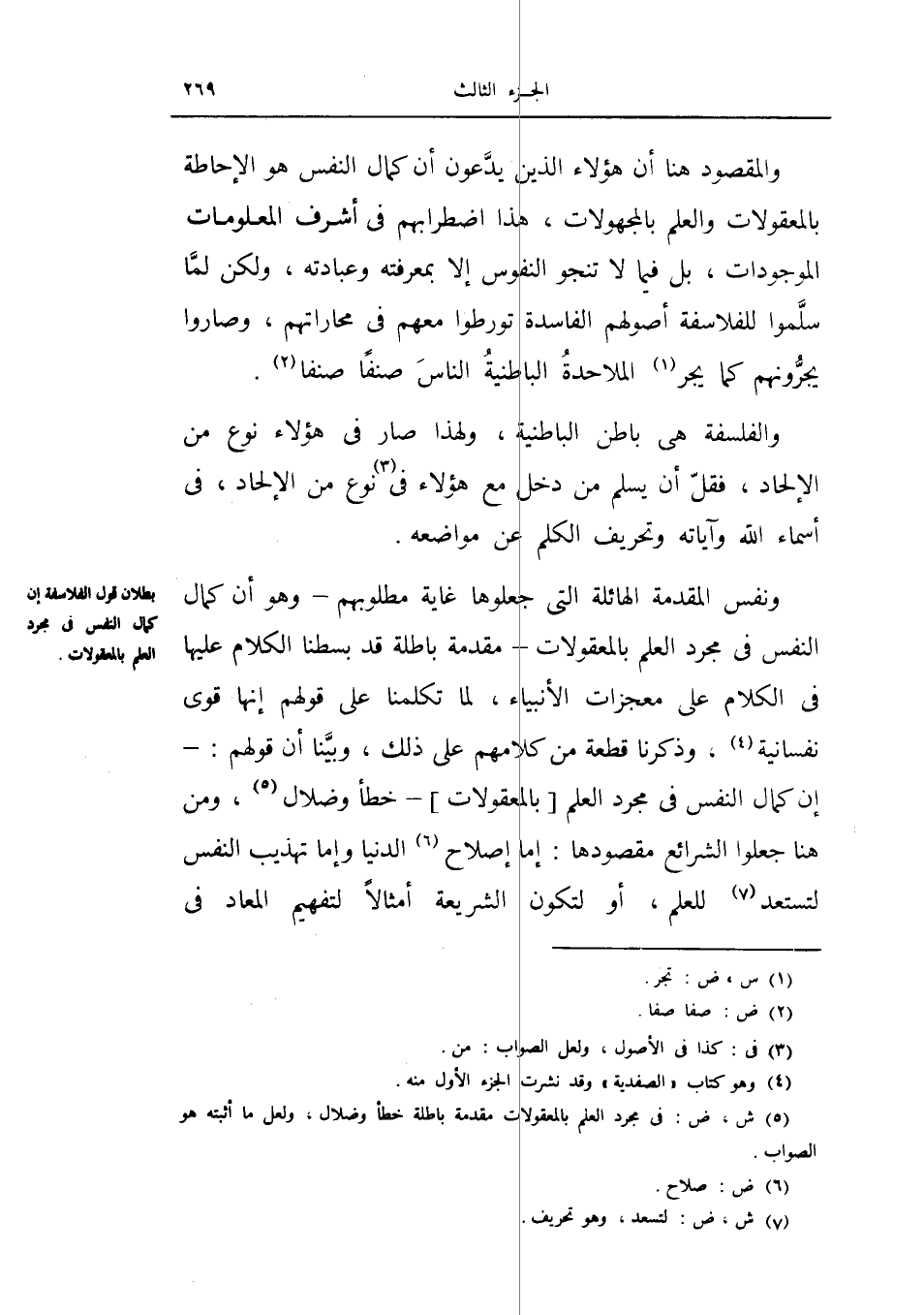 والمقصود هنا أن هؤلاء الذين يدعونان كمال النفس هو الإحاطة بالمعقولات والعلم بالمجهولات هذا اظطرابهم في أشرف المعلومات الموجودات، بل فيما لا تنجو النفوس إلا بمعرفته وعبادته، ولكن لما سلموا للفلاسفة أصولهم الفاسدة تورطوا معهم في محاراتهم وصاروا يجرونهم كما يجر الملاحدة الباطنية الناس صنفاً صنفاً.