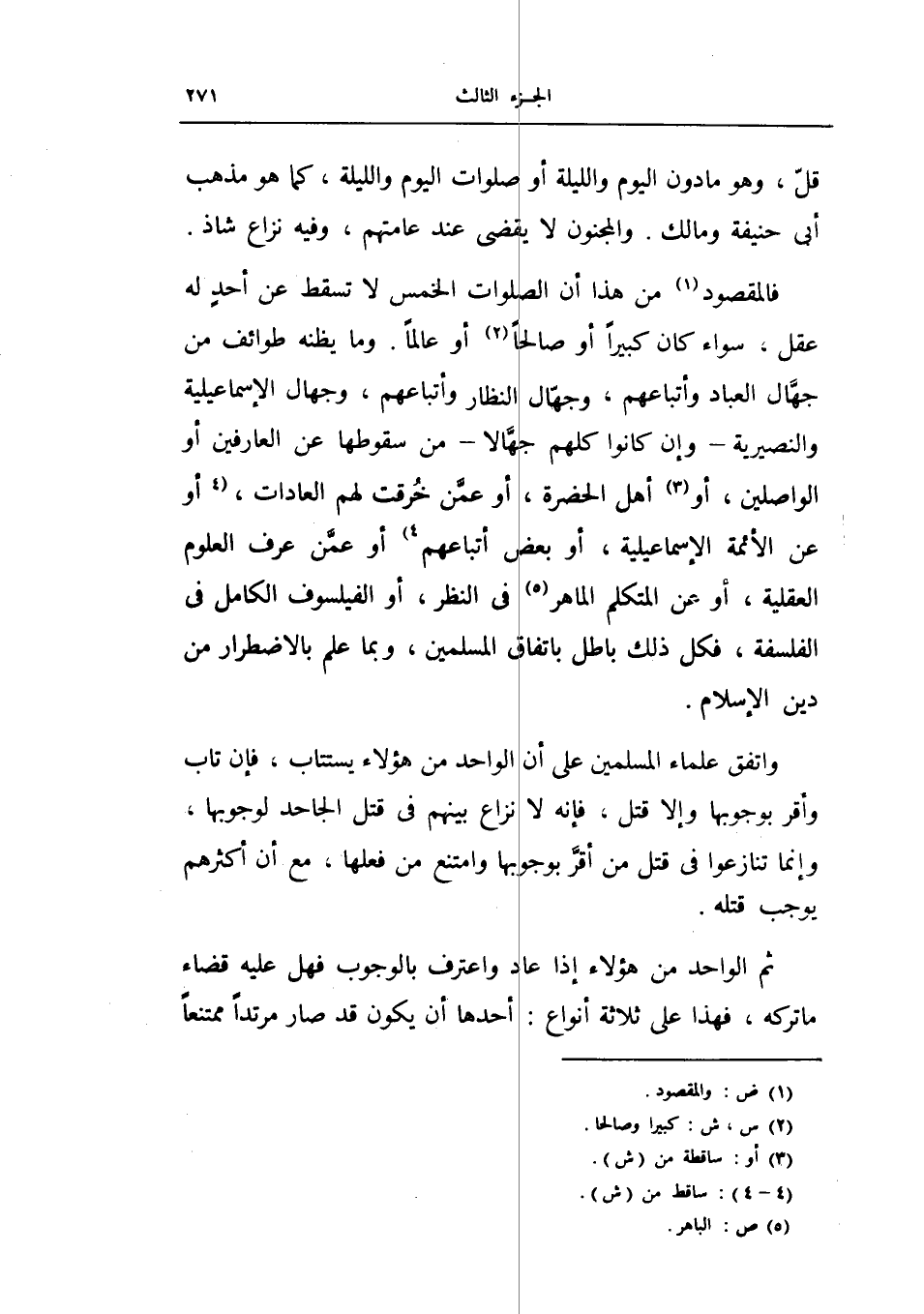 وما يظنه طوائف من جهال العباد وأتباعهم، وجهال النظار وأتباعهم وجهال الإسماعيلية والنصيرية وإن كانوا كلهم جهالاً من سقوطها عن العارفين أو الواصلين او أهل الحضرة أو عمن خرقت لهم العادات، أو عن الأئمة الإسماعيلية أو بعض أتباعهم أو عمن عرف العلوم العقلية أو عن المتكلم الماهر في النظر أو الفيلسوف الكامل في الفلسفة فكل ذلك باطل باتفاق المسلمين وبما علم بالاضطرار من دين الإسلام.