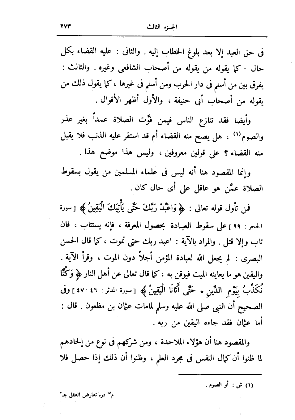 فمن تأول قوله تعالى {واعبد ربك حتى يأتيك اليقين} الحجر: 99، على سقوط العبادة بحصول المعرفة فإنه يستتاب ن فإن تاب وإلا قتل.
