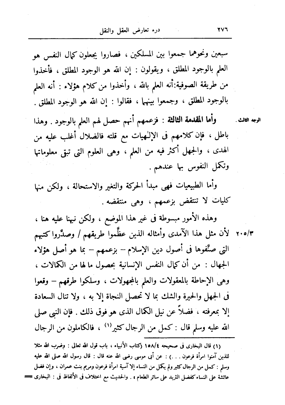 وهذه الأمور مبسوطة في غيرهذا الموضع، ولكن نبهنا عليه هنا، لأن مثل هذا الآمدي وأمثاله الذين عضموا طريقهم وصدروا كتبهم التي صنفوها في أصول دين الإسلام بزعمهم بما هو أصل هؤلاء الجهال: من أن كمال النفس الإنسانية بحصول ما لها من الكمالات، وهي الإحاطة بالمعقولات والعلم بالمجهولات، وسلكوا طرقهم وقعوا في الجهل والحيرة والشك بما لا تحصل النجاة إلا به، ولا تنال السعادة إلا بمعرفته، فضلاً عن نيل الكمال الذي هو فوق ذلك، فإن النبي صلى الله عليه وسلم قال: «كمل من الرجال كثير» فالكاملون من الرجال