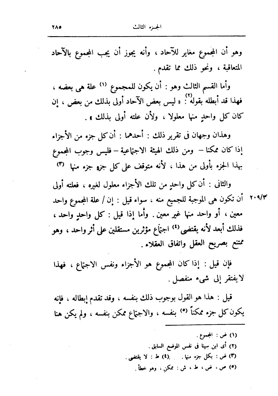 وأما القسم الثالث وهو أن يكون للمجموع علة هي بعضه، فهذا قد أبطله بقول ليس بعض الآحاد أولى بذلك من بعض، إن كان كل واحد منها معلولاً، ولأن علته اولى بذلك