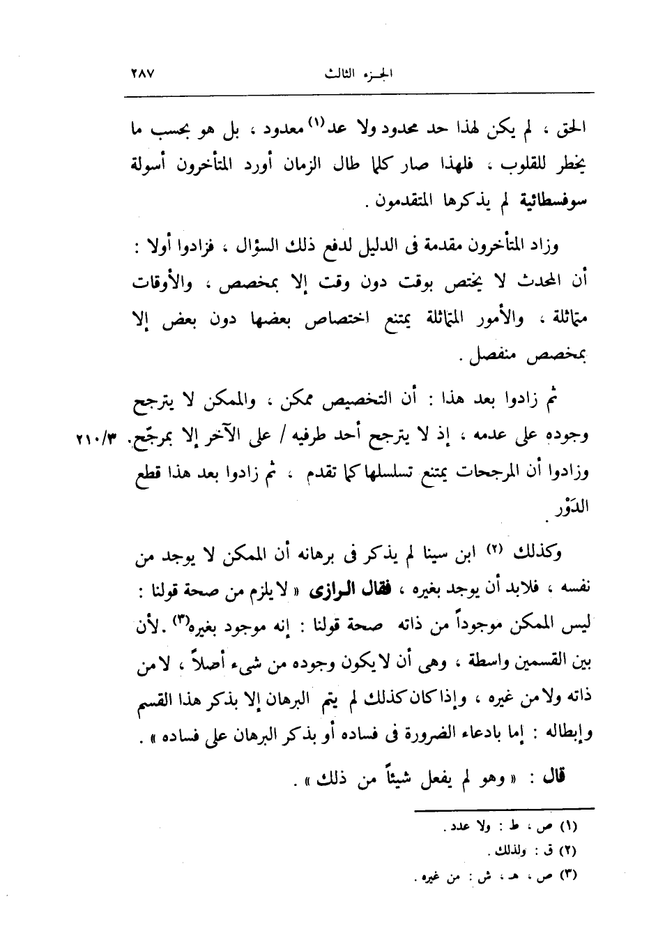 وكذلك ابن سينا لم يذكر في برهانه أن الممكن لا يوجد من نفسه فلا بد أن يوجد بغيره فقال الرازي لا يلزم من صحة قولنا ليس الممكن موجوداً من ذاته صحة قولنا: إنه موجود بغيره لأن بين القسمين واسطة وهي أن لا يكون وجوده من شيء أصلاً لا من ذاته ولا من غيره وإذا كان كذلك لم يتم البرهان إلا بذكر هذا القسم وإبطاله: إما بادعاء الضرورة في فساده أو بذكر البرهان على فساده.