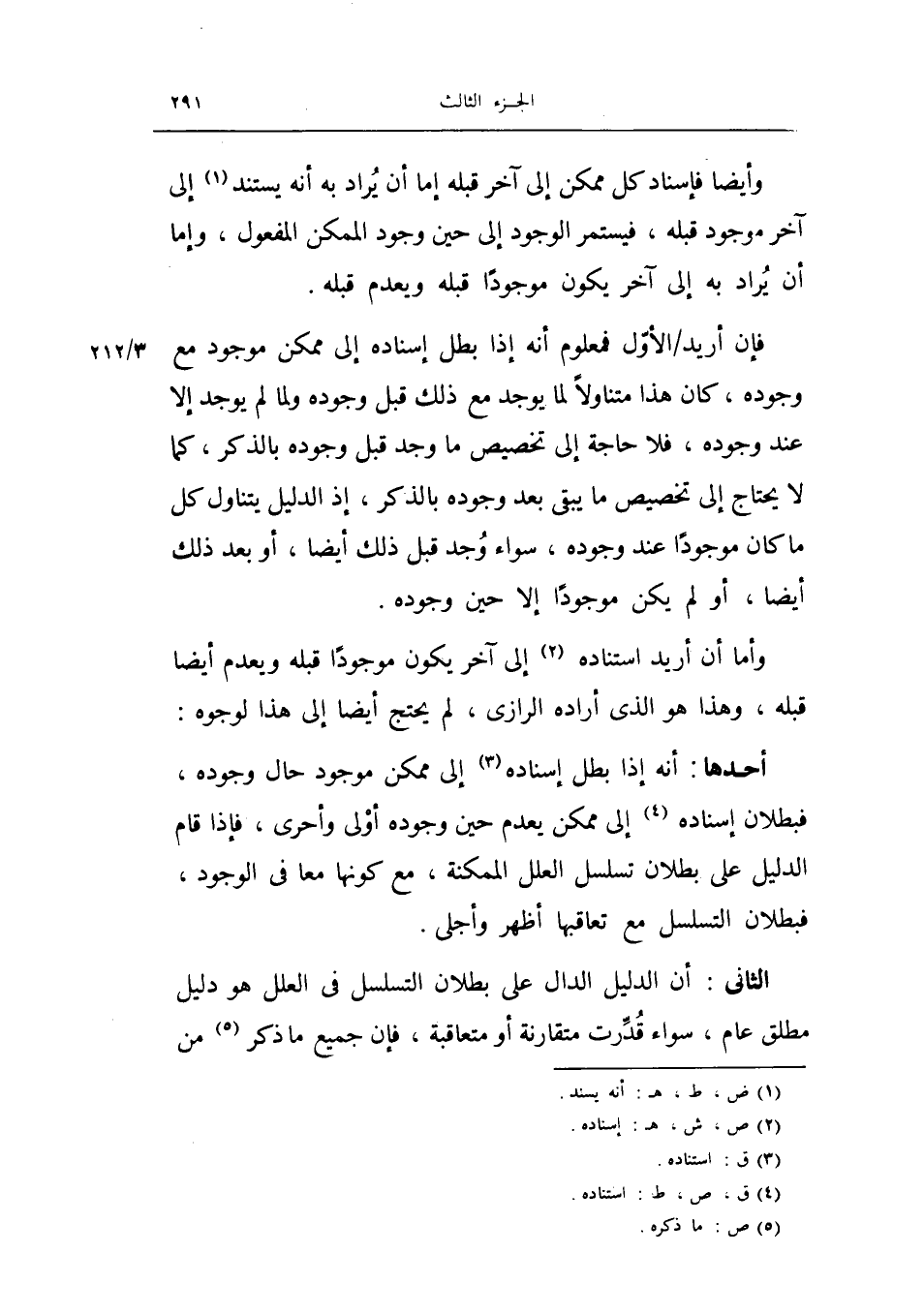 وأما إن أريد أستناده إلى الآخر يكون موجوداً قبله ويعدم أيضاً قبله، وهذا هو الذي أراده الرازي لم يحتج أيضاً إلى هذا لوجوه: