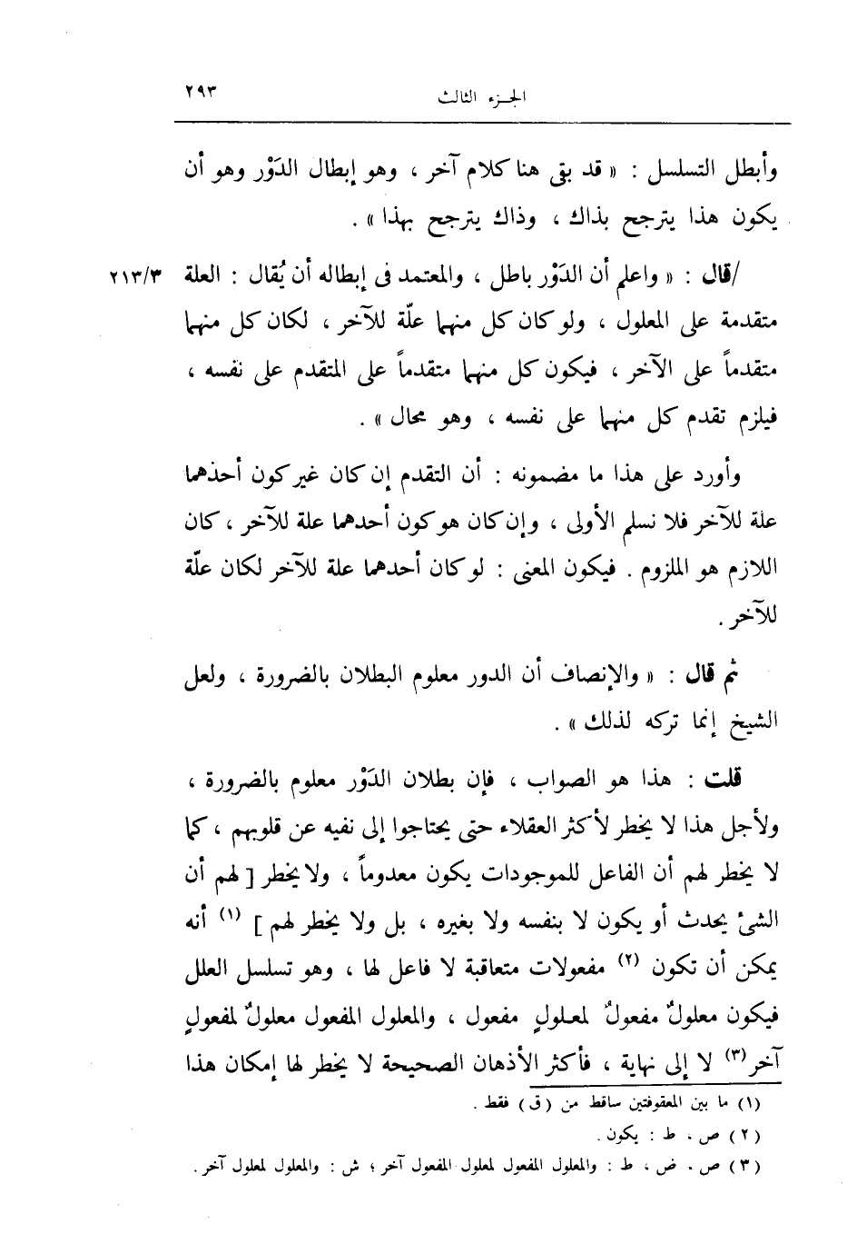 ثم قال والإنصاف أن الدور معلوم البطلان بالضرورة ولعل الشيخ إنما تركه لذلك.
