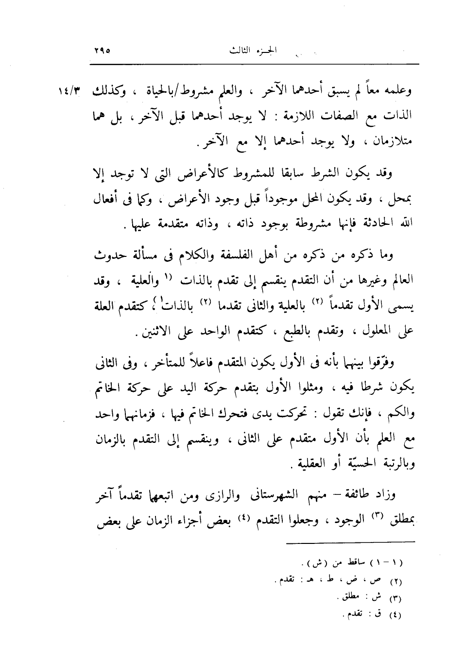 وزاد طائفة منهم الشهرستاني والرازي ومت اتبعهما تقدماً آخر يمطلق الوجود، وجعلوا التقدم بعض أجزاء الزمان على بعض