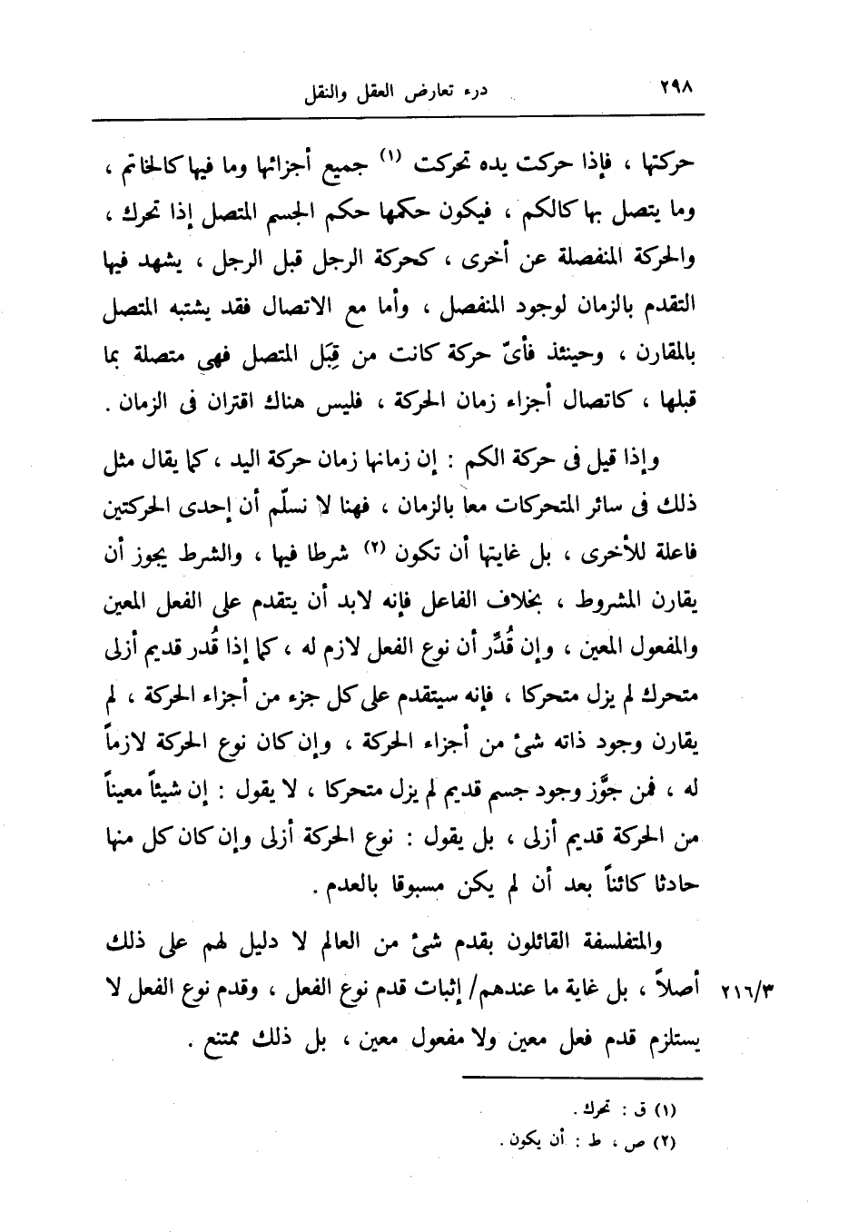 وإذا قيل في حركة الكم: إن زمانها حركة اليد، كما يقال مثل ذلك في سائر المتحركات معاً بالزمان، فهنا لا نسلم أن إحدى الحركتين فاعلة للآخرى، بل غايتها أن تكون شرطاً فيها، والشرط يجوز أن يقارن المشروط، بخلاف الفاعل فإنه لا بد أن يتقدم على الفعل المفعول المعين، وإن قدر أن نوع الفعل لازم له، كما؟ إذا قدر قديم أزلي متحرك لم يزل متحركاً، فإنه سيتقدم على كل جزء من أجزاء الحركة لم يقارن وجود ذاته شيء من أجزاء الحركة وإن كان نوع الحركة لازماً له فمن حوز وجود جسم قديم لم يزل متحركاً، لا يقول: إن شيئاً معيناً من الحركة قديم أزلي، بل يقول: نوع الحركة أزلي وإن كان كل منها حادثاً كائناً بعد ان لم يكن مسبوقاً بالعدم.
