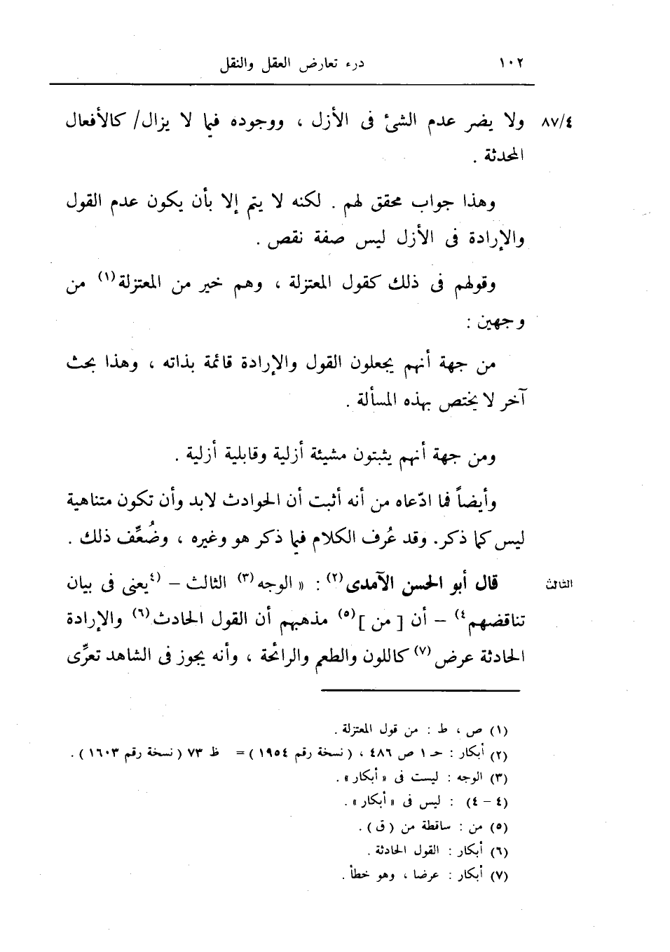 قال أبو الحسن الآمدي يعني في بيان تناقضهم أن من مذهبهم أن القول الحادث والإرادة الحادثة عرض كاللون والطعم والرائحة، وأنه يجوز في الشاهد تعري