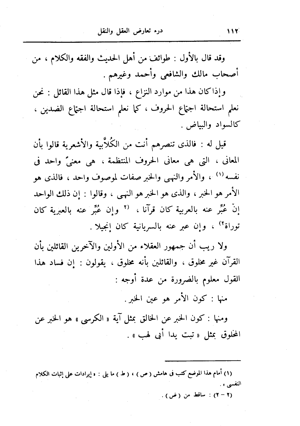 قيل له فالذي تنصرهم أنت من الكلابية والأشعرية قالوا بأن المعاني التي هي معاني الحروف المنتظمة، هي معنى واحد في نفسه والأمر والنهي والخبر صفات لموصوف واحد، فالذي هو الأمر هو الخبر ن والذي هو الخبر هو النهي وقالوا إن ذلك بالسريانية كان إنجيلاً.