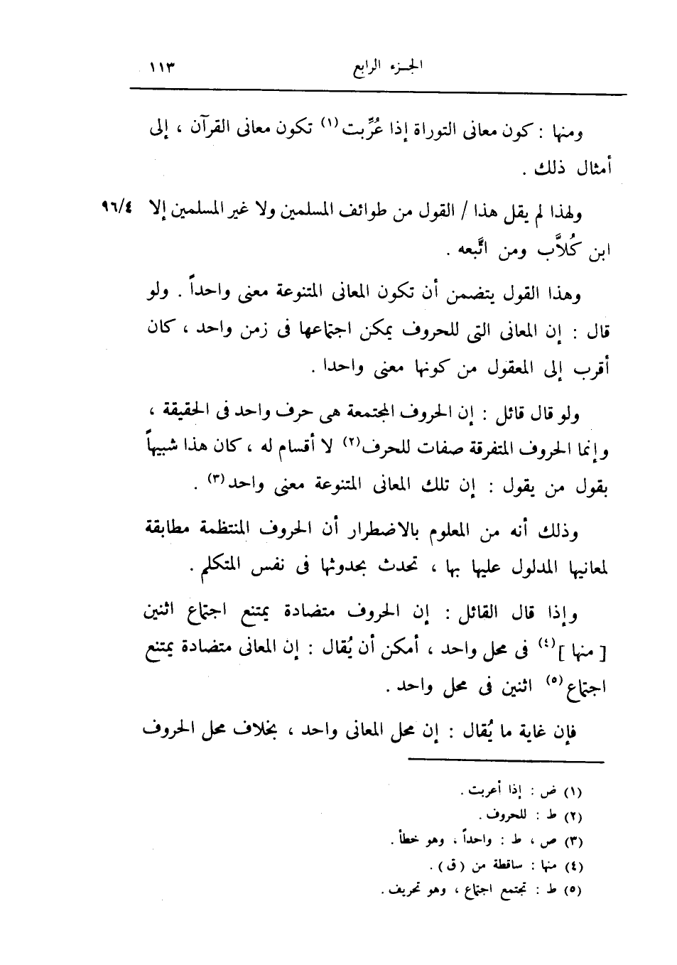ولو قال قائل إن الحروف المجتمعة هي حرف واحد في الحقيقة، وغنما الحروف المتفرقة صفات للحرف لا أقسام له، كان هذا شبيهاً بقول من يقول إن تلك المعاني المتنوعة معنى واحد.