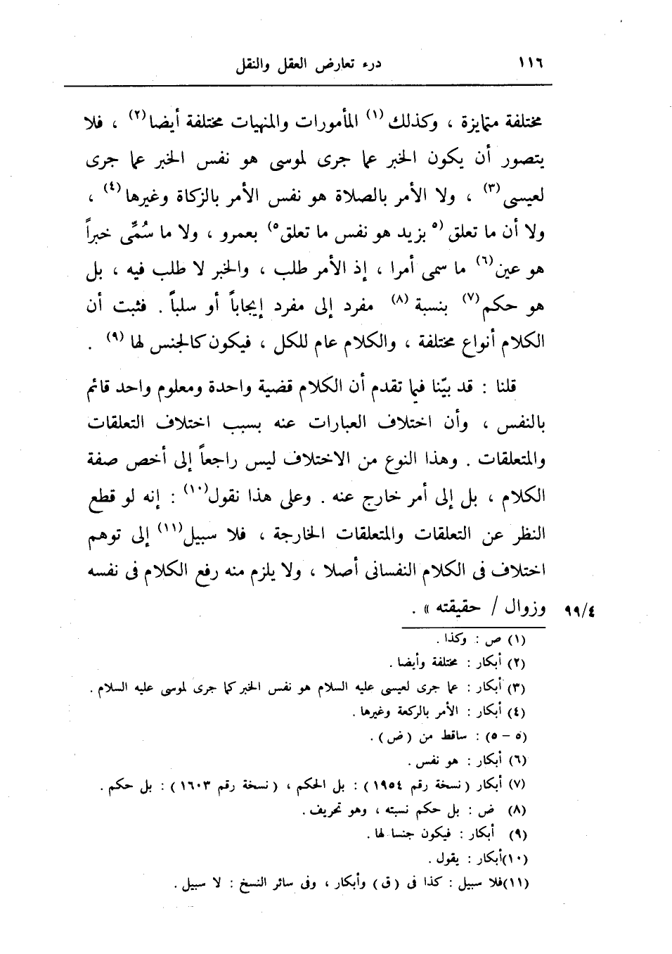 قلنا قد بينا فيما تقدم أن الكلام قضية واحدة ومعلوم واحد قائم بالنفس، وأن اختلاف العبارات عنه بسبب اختلاف التعلقات والمتعلقات وهذا النوع من الاختلاف ليس راجعاً إلى اخص صفة الكلام بل إلى أمر خارج عنه وعلى هذا نقول إنه لو قطع النظر عن التعلقات والمتعلقات الخارجة فلا سبيل إلى توهم اختلاف في الكلام النفساني أصلاً ولا يلزم منه رفع الكلام في نفسه وزوال حقيقته.