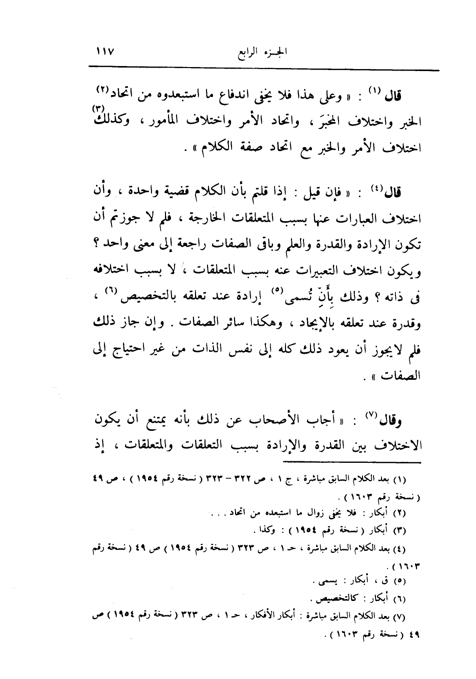 قال فإن قيل إذا قلتم بأن الكلام قضية واحدة وأن اختلاف العبارات عنها بسبب المتعلقات الخارجة فلم لا جوزتم أن تكون الإرادة والقدرة والعلم وباقي الصفات راجعة إلى معنى واحد ويكون اختلاف التعبيرات عنه بسبب المتعلقات لا بسبب اختلافه في ذاته وذلك بأن تسمى إرادة عند تعلقه بالتخصيص وقدرة عند تعلقه بالإيجاد وهكذا سائر الصفات.