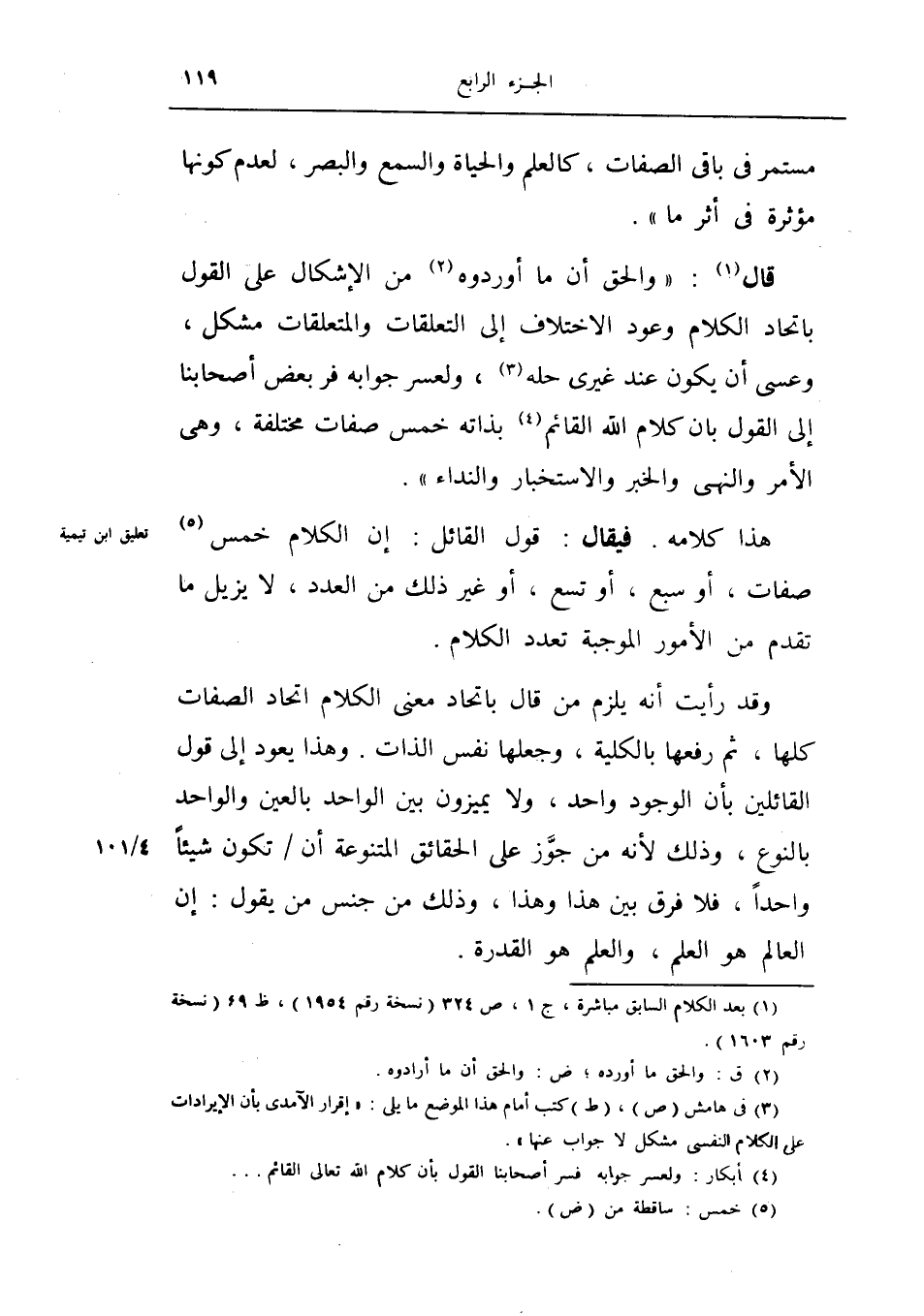 وقد رأيت انه يلزم من قال باتحاد معنى الكلام اتحاد الصفات كلها، ثم رفعها بالكلية، وجعلها نفس الذات وهذا يعود إلى قول القائلين بان الوجود واحد، ولا يميزون بين الواحد بالعين والواحد بالنوع، وذلك لأنه من جوز على الحقائق المتنوعة أن تكون شيئاً واحداً غلا فرق بين هذا وهذا وذلك من جنس من يقول إن العالم هو العلم والعلم هو القدرة.
