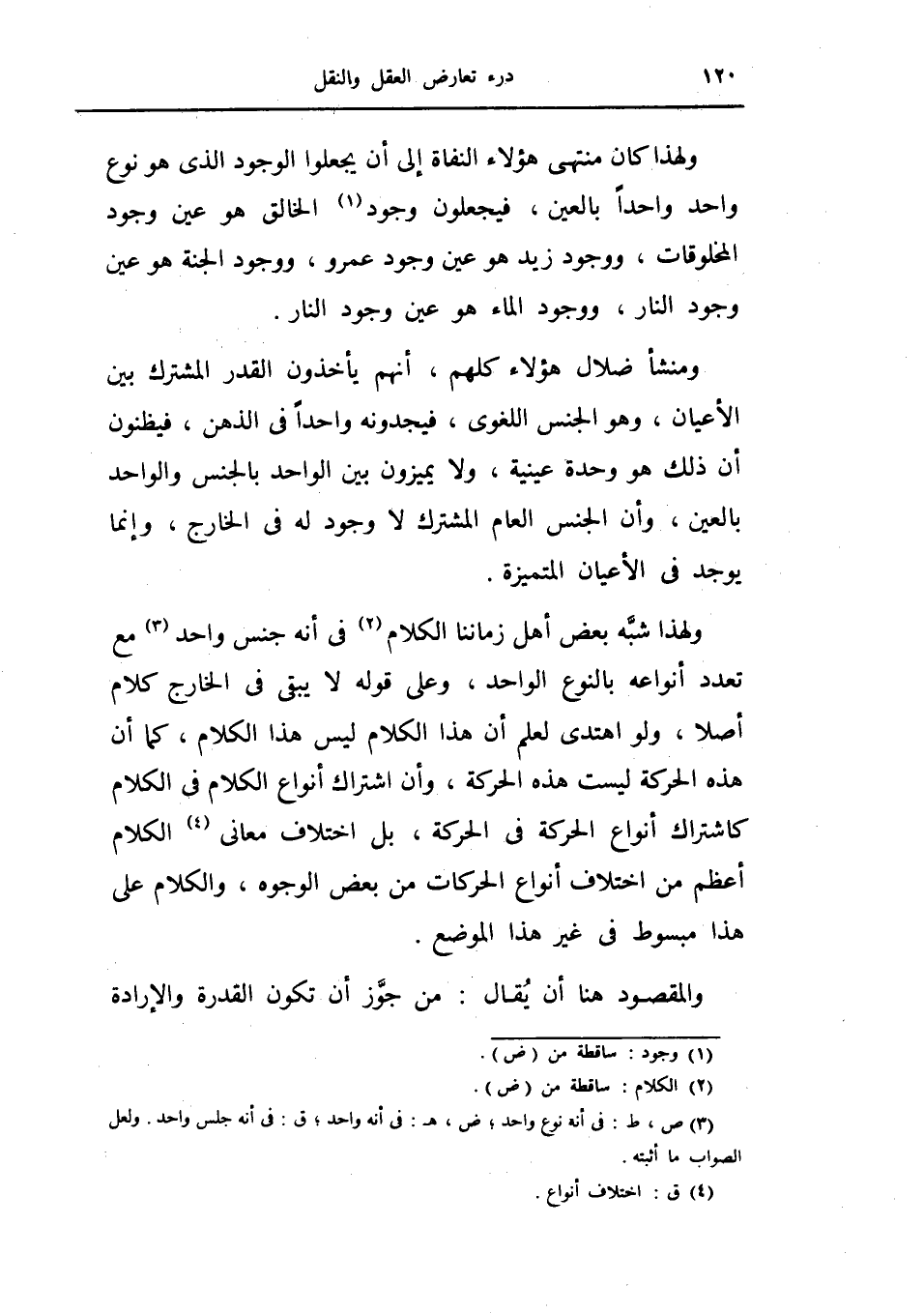 ولهذا كان منتهى هؤلاء النفاة إلى أن يجعلوا الوجود الذي هو نوع واحد واحداً بالعين، فيجعلون وجود الخالق هو عين وجود المخلوقات، ووجود زيد هو عين وجود عمرو، ووجود الجنة هو عين وجود النار ووجود الماء هو عين وجود النار.