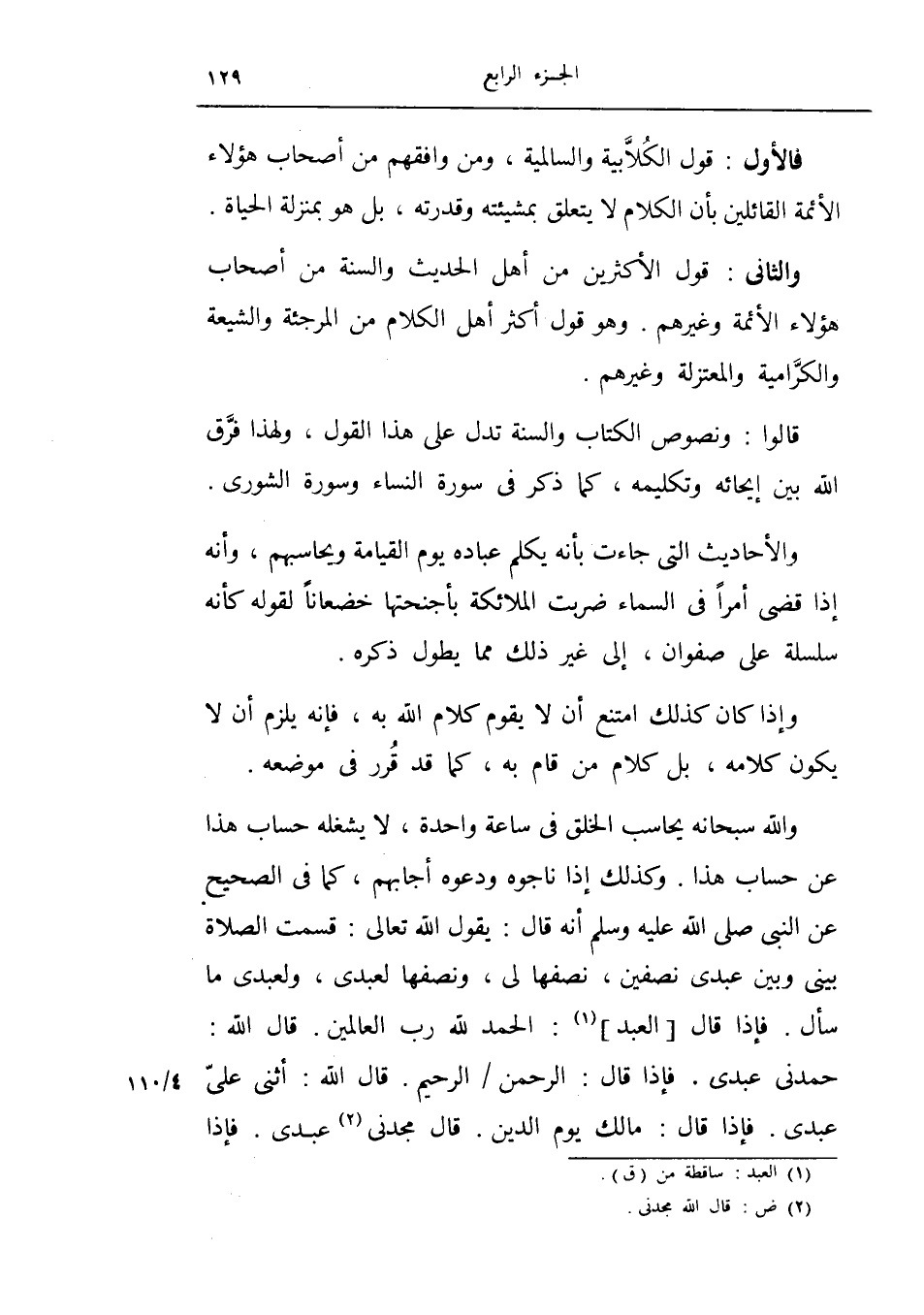 فالأول: قول الكلابية والسالمية، ومن وافقهم من أصحاب هؤلاء الأئمة القائلين بان الكلام لا يتعلق بمشيئته وقدرته بل هو بمنزلة الحياة.