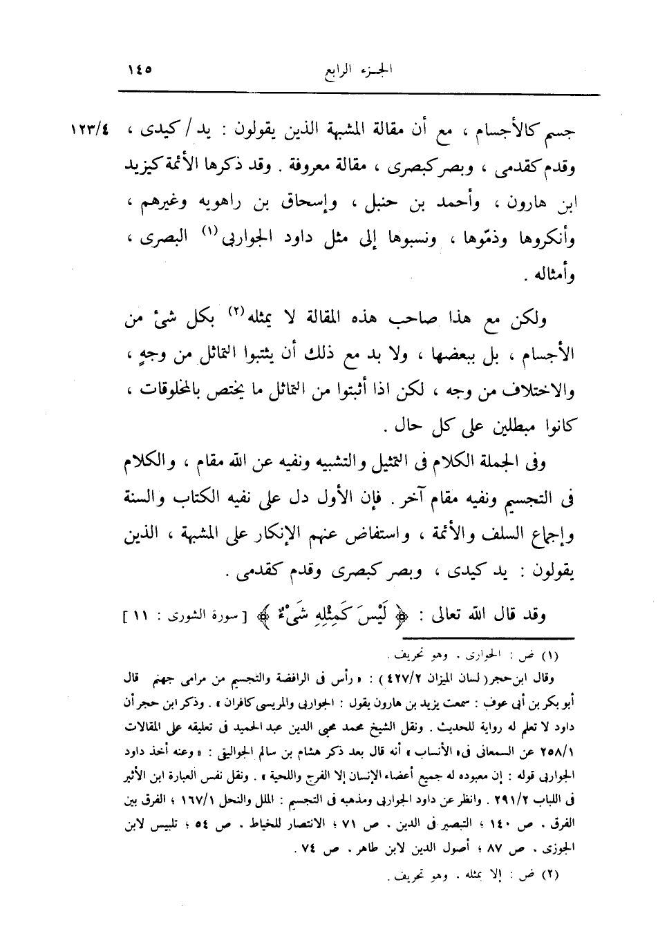 جسم كالجسام مع أن مقالة المشبهة الذين يقولون يد كيدي وقدم كقدمي وبصر كبصري مقالة معروفة وقد ذكرها الأئمة كيزيد ابن هارون، واحمد بن حنبل، وإسحاق بن راهوية وغيرهم وأنكروها وذموها، ونسبوها إلى مثل داود الجواربي البصري وأمثاله.