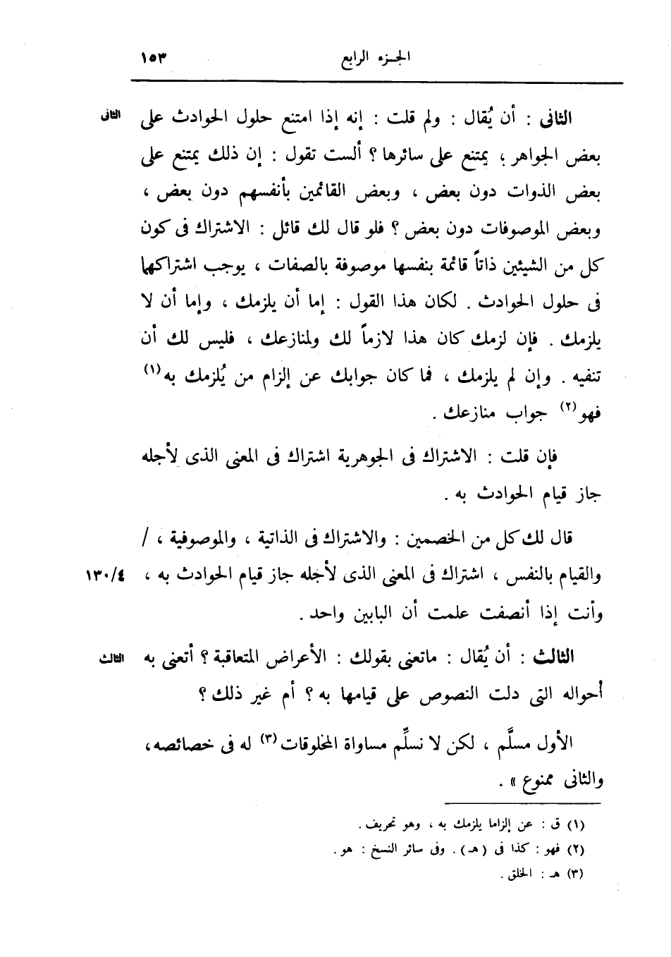 الثانية أن يقال ولم قلت إنه إذا امتنع حلول الحوادث على بعض الجواهر بعض وبعض القائمين بأنفسهم دون بعض وبعض الموصوفات دون بعض فلو قال لك قائل الاشتراك في كون كل من الشيئين ذاتاً قائمة بنفسها موصوفة بالصفات يوجب اشتراكهما في حلول الحوادث لكان هذا القول إما أن يلزمك وإما أن لا يلزمك فإن لزمك كان هذا لازماً لك ولمنازعك فليس لك أن تنفيه وإن لم يلزمك فما كان جوابك عن إلزام من يلزمك به هو جواب منازعك.