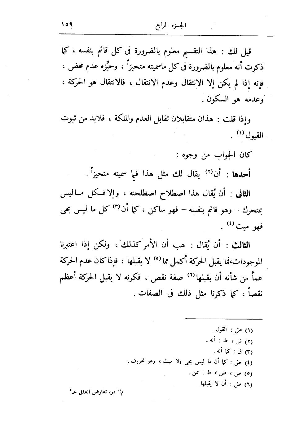 قيل لك: هذا التقسيم معلوم بالضرورة في كل قائم بنفسه، كما ذكرت أنه معلوم بالضرورة في كل ما سميته متحيزاً، وحيزه عدم محض فإنه إذا لم يكن إلا الانتقال وعدم الانتقال فالانتقال هو الحركة وعدمه هو السكون.