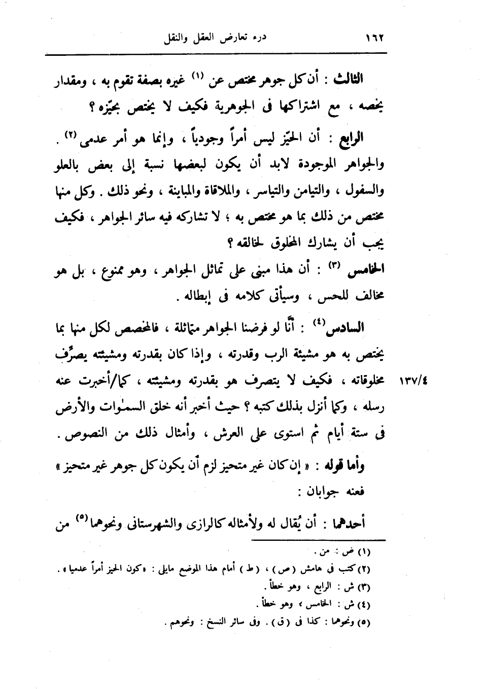 السادس: أنا لو فرضنا الجواهر متماثلة فالمخصص لكل منها بما يختص به هو مشيئة الرب وقدرته وإذا كان بقدرته ومشيئته يصرف مخلوقاته فكيف لا يتصرف هو بقدرته ومشيئته، كما أخبرت عنه رسله وكما انزل بذلك كتبه حيث أخبر أنه خلق السماوات والأرض في ستة أيام ثم أستوى على العرش، وأمثال ذلك من النصوص.