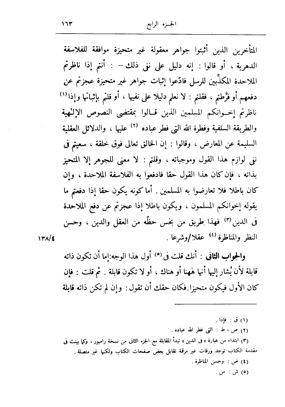 المتأخرين الذين أثبتوا جواهر معقولة غير متحيزة موافقة للفلاسفة الدهرية أو قالوا: إنه دليل على نفي ذلك: أنتم إذا ناظرتم الملاحدة المكذبين فادعوا إثبات جواهر غير متحيزة عجزتم عن دفعهم أو فرطتم، فقلتم: لا نعلم دليلا على نفيها، أو قلتم بإثباتها وإذا ناظرتم إخوانكم المسلمين الذين قالوا بمقتضى النصوص الإلهية والطريقة السلفية وفطرة الله التي فطر عباده عليها، والدلائل العقلية السليمة عن المعارض، وقالوا: إن الخالق تعالى فوق خلقه، سعيتم في نفي هذا القول لوازم هذا القول وموجباته، وقلتم: لا معنى للجوهر إلا المتحيز بذاته، فإن كان هذا القول حقا فادفعوا به الفلاسفة الملاحدة، وإن كان باطلا فلا تعارضوا به المسلمين.