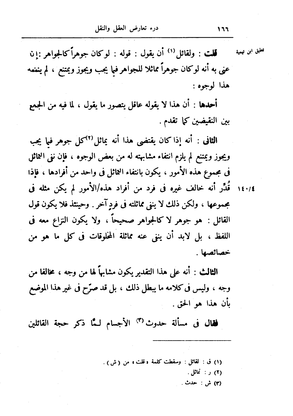 الثاني انه إذا كان يقتضي هذا أنه يماثل كل جوهر فيما يجب ويجوز ويمتنع لم يلزم انتفاء مشابهته له من بعض الوجوه، فغن نفي التماثل في مجموع هذه الأمور، يكون بانتفاء التماثل في واحد من أفرادها فإذا قدر انه خالف غيره في فرد هذه الأمور لم يكن مثله في مجموها ولكن ذلك لا ينفي مماثلة في فرد آخر وحينئذ فلا يكون قول القائل: هو جوهر لا كالجواهر صحيحاً، ولا يكون النزاع معه في اللفظ بل لا بد ان ينفي عنه مماثلة المخلوقات في كل ما هو من خصائصها.