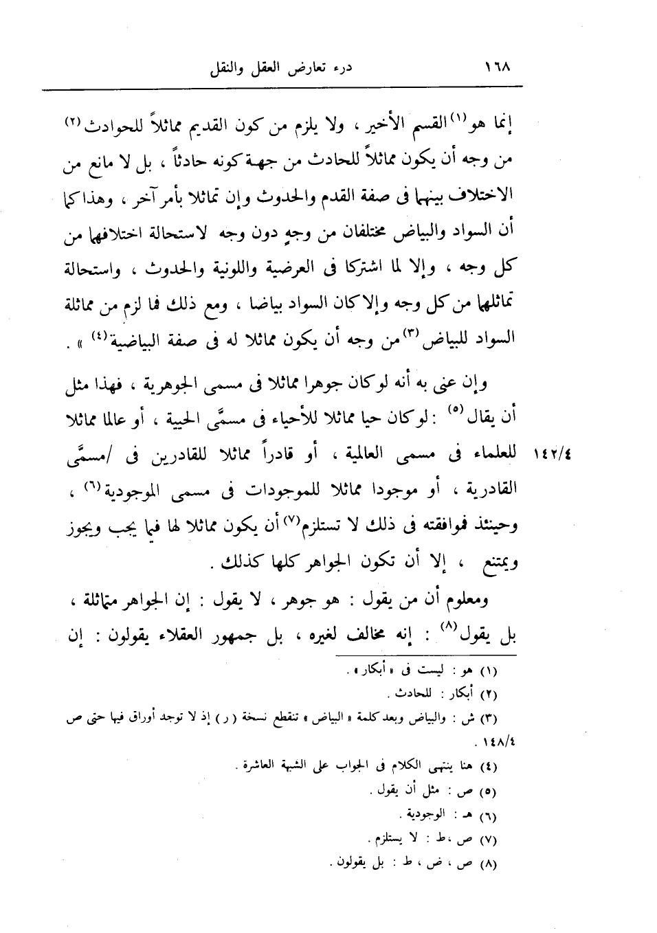إنما هو القسم الأخير، ولا يلزم من كون القديم مماثلا للحوادث من وجه أن يكون مماثلاً للحادث من جهة كونه حادثاً، بل لا مانع من الاختلافات بينهما في صفة القدم والحدوث وإن تماثلاً بأمر آخر، وهذا كما أن السواد والبياض مختلفان من وجه دون وجه لاستحالة اختلافهما من كل وجه وإلا لما اشتركا في العرضية واللونية والحدوث، واستحالة تماثلها من كل وجه وإلا كان السواد بياضاً ومع ذلك فما لزم من مماثلة السواد للبياض من وجه أن يكون مماثلاً له في صفة البياضية.